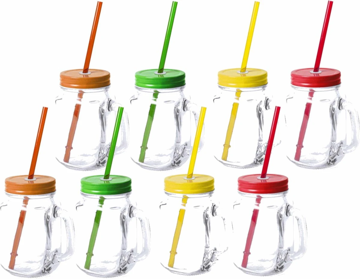 8x pcs Verres Mason Jar gobelets / bocaux avec bouchon et paille 500 ml. Belles tasses d’été colorées pour limonade, shakes, cocktails ou mélanges. Taille environ: 7,5 x 13,5 cm. 2x pièces par couleur. Vous recevrez les couleurs rouge, vert, jaune et orange. Matière : verre. composé de 2x pcs Verres Mason Jar tasses à boire bouchon jaune et paille 500 ml, 2x pcs verre Mason Jar tasses à boire bouchon orange / paille 500 ml, 2x pcs Verres Mason Jar tasses à boire bouchon rouge et paille 500 ml, 2x pcs verre Mason Jar à boire tasses bouchon vert / paille 500 ml