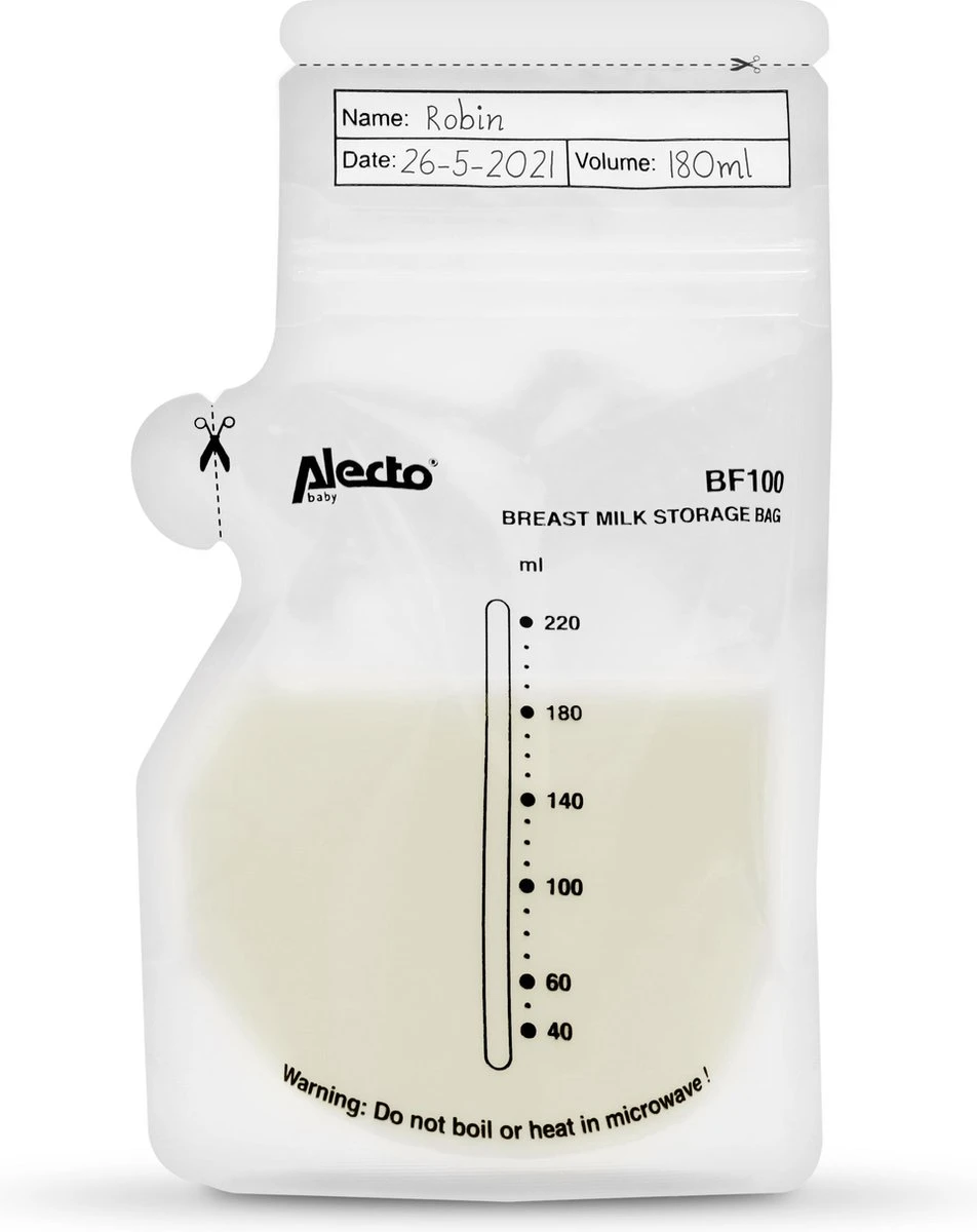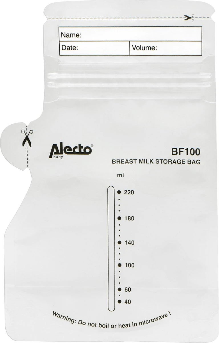 Les sacs de conservation de lait maternel Alecto BF100 sont également totalement hermétiques grâce à la double fermeture à glissière. Ils disposent aussi d’un bec verseur pratique, vous pouvez ainsi facilement les utiliser lorsque vous êtes sur la route.