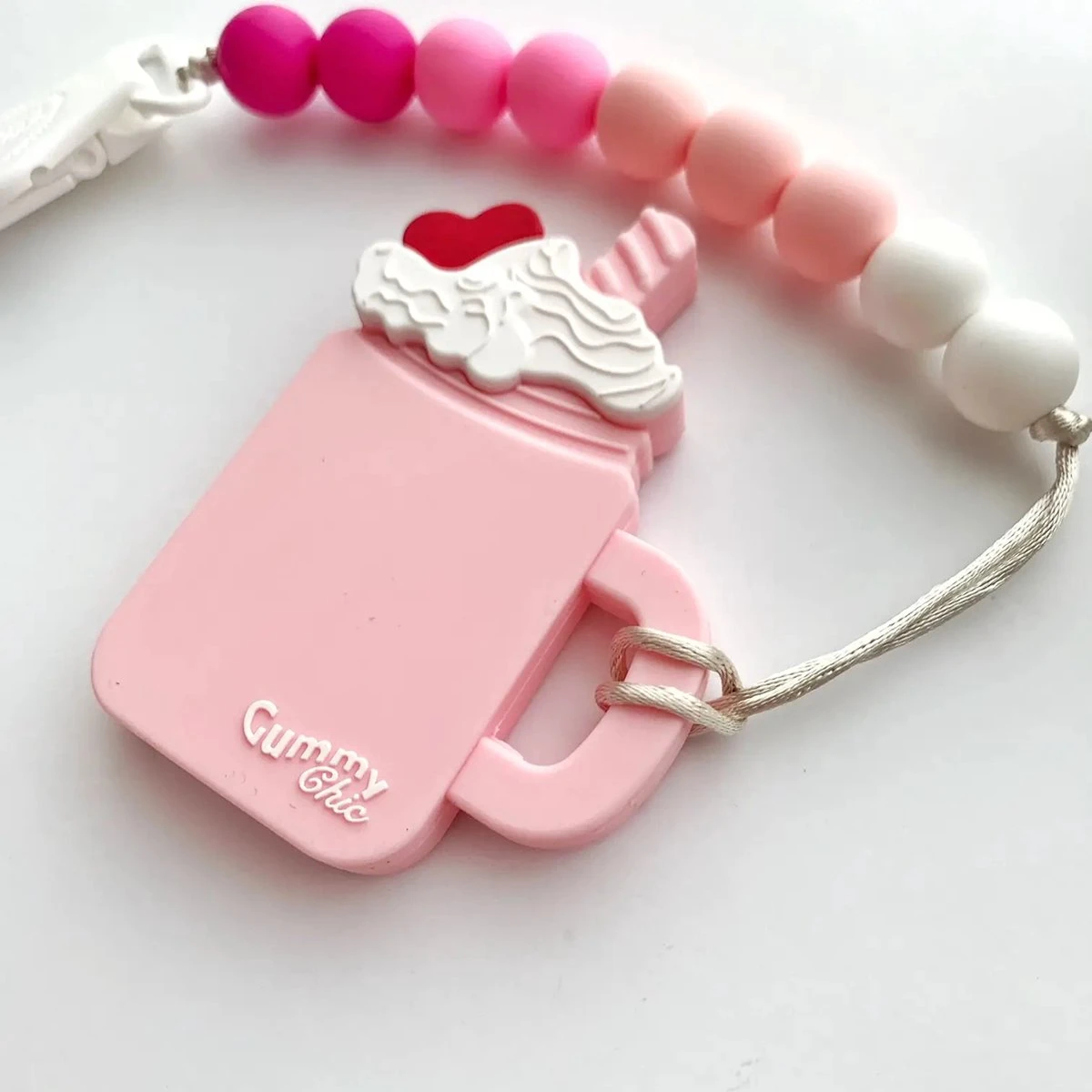 Fabriqué à partir de silicone 100% de qualité alimentaire et exempt de produits chimiques nocifs. Le milkshake peut également être retiré de la chaîne de billes pour y attacher autre chose. L’anneau de dentition est donc également facile à remettre à votre enfant.
