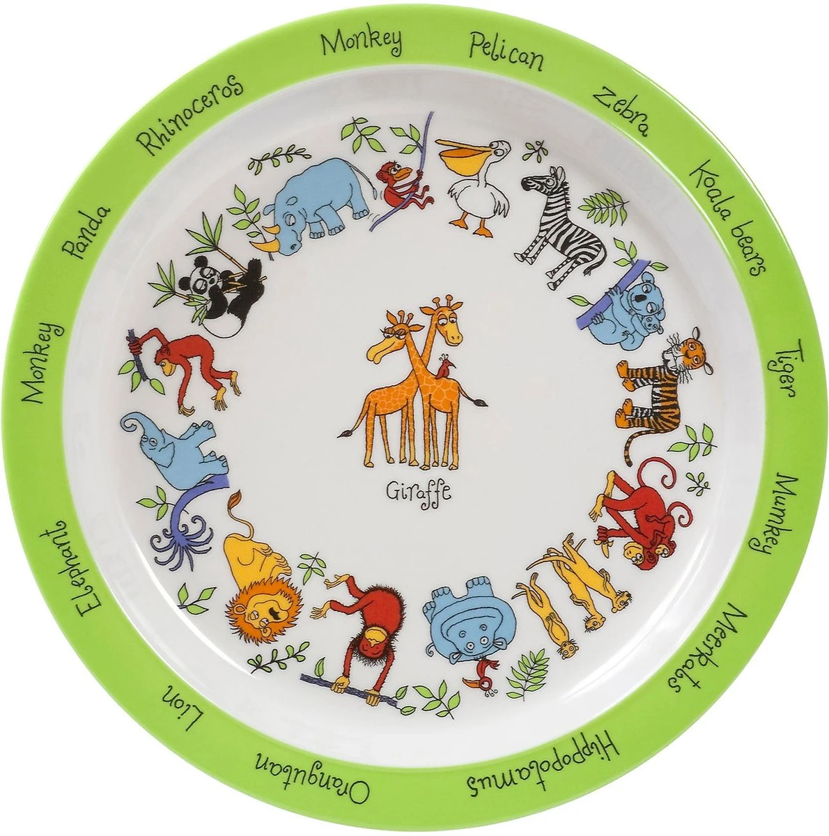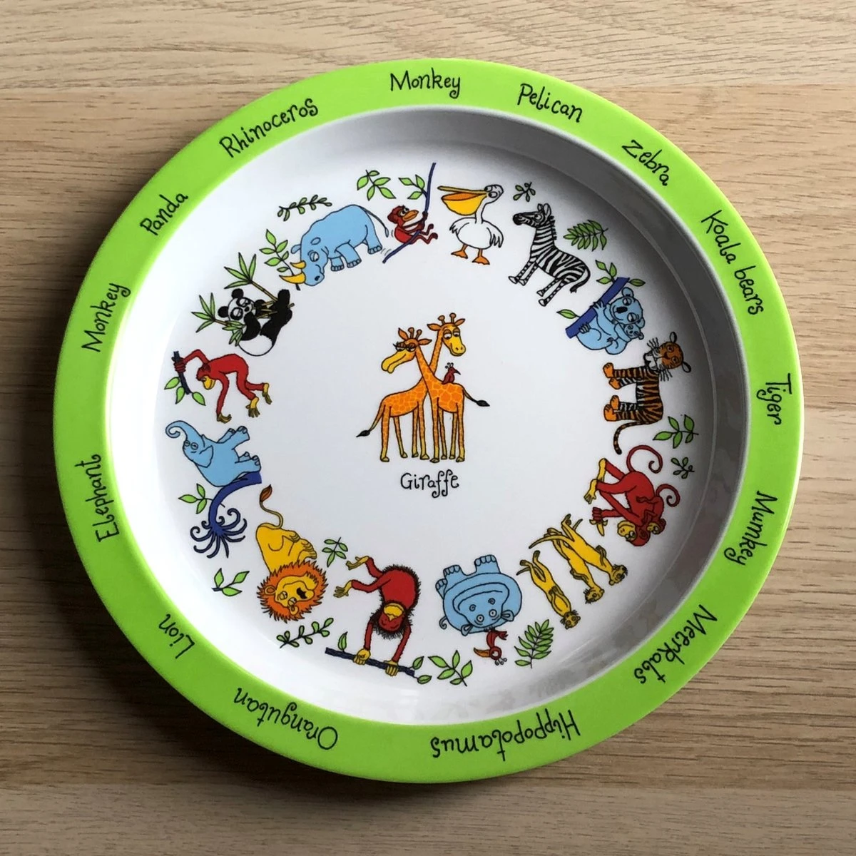 assiette pour enfant en mélamine par Tyrrell Katz (Londres)avec des illustrations amusantes d’animaux de la jungle
