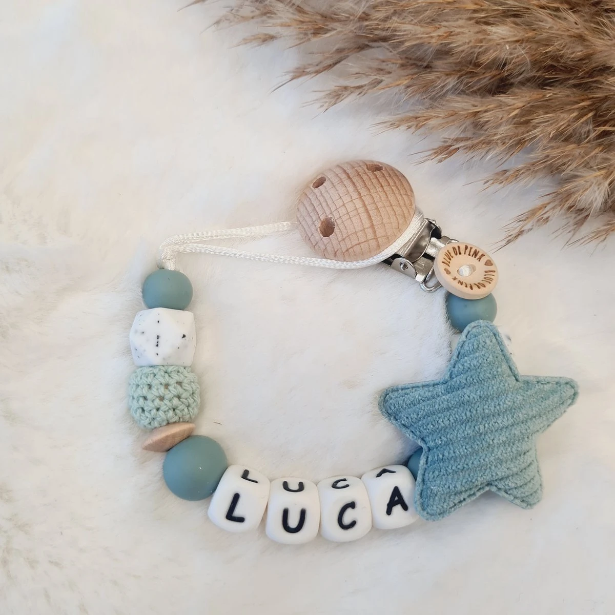 Cette attache tétine conçue par Blue or Pink est finie avec une attache en bois et une étoile bleue vintage ! Les perles de silicone sont un mélange de bleu vintage, de vert vintage et de blanc avec des perles mouchetées. Il y a aussi des perles vertes au crochet et des perles en bois dans ce cordon. Les perles de lettre sont également en silicone, mais si vous le souhaitez, des perles en bois peuvent également être utilisées (veuillez nous le faire savoir avec le naam).Cette attache-tétine est un bon choix pour les garçons et les filles !