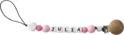 En raison de la personnalisation, la longueur de l’attache-tétine peut varier. Le nom peut être composé de 8 lettres au maximum. Malheureusement, nous ne pouvons pas utiliser de lettres spéciales telles que ë ou á.