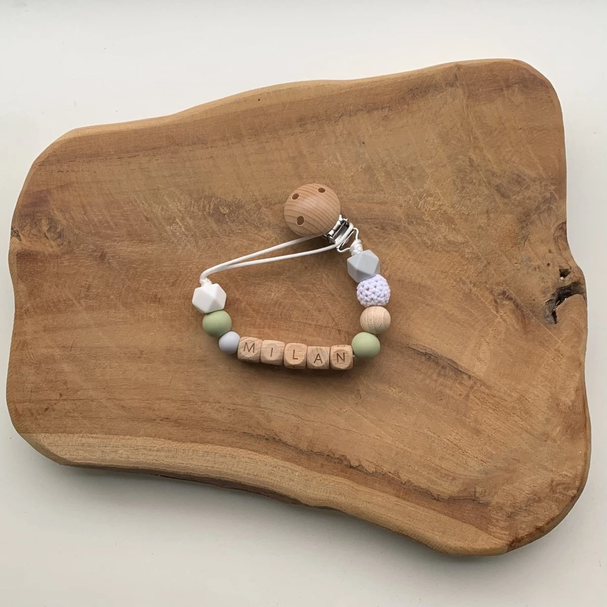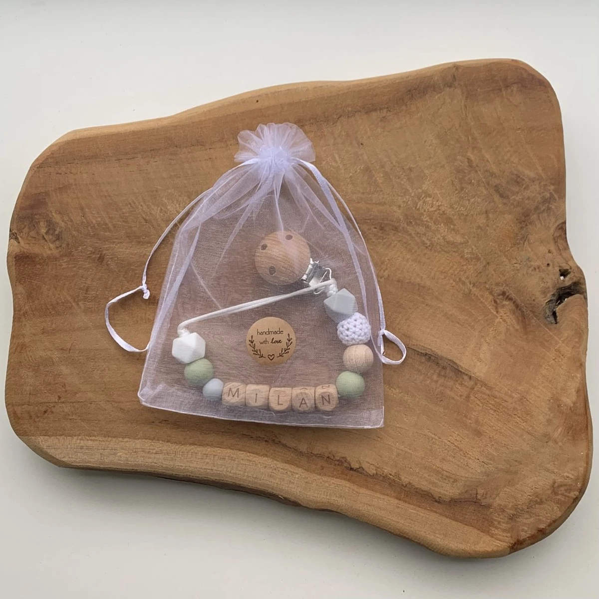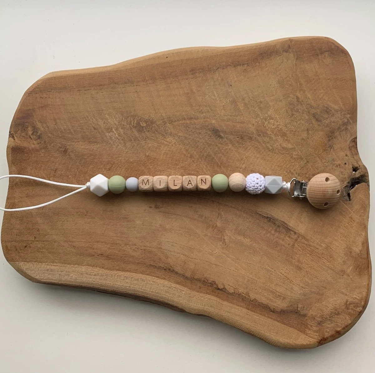 · Lors de la personnalisation d’une attache tétine, il est possible que la composition (due à la longueur du naam) diffère légèrement de la photo. Le style reste bien sûr le même.