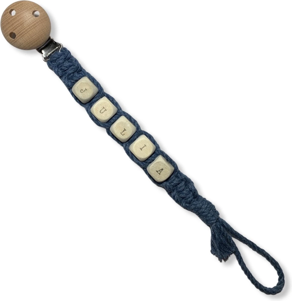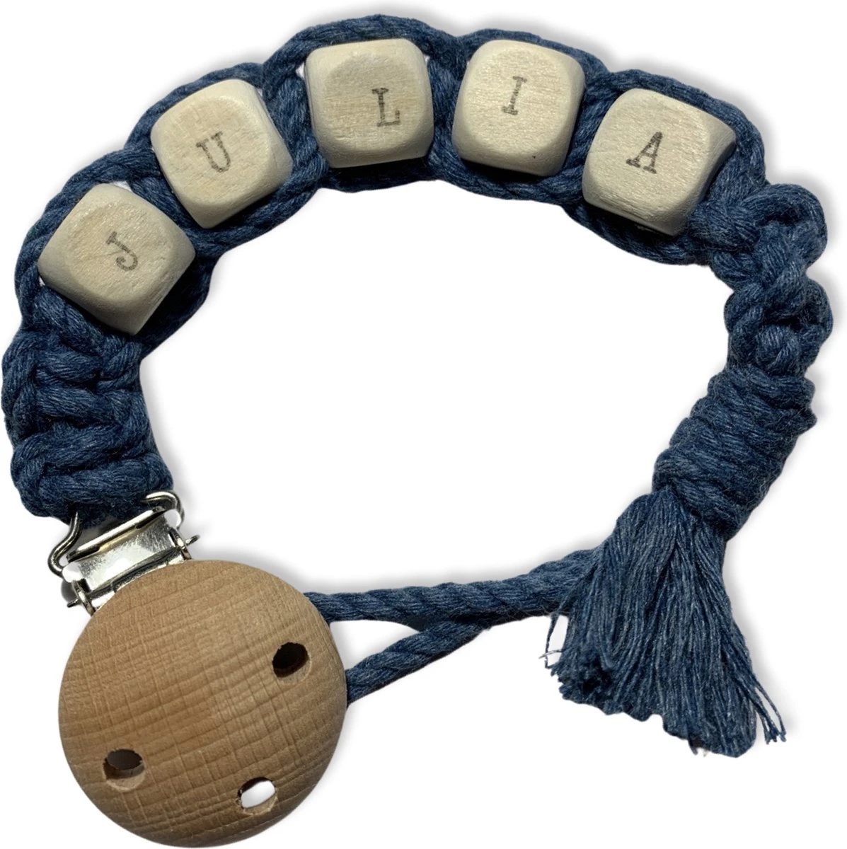 Attache tétine macramé personnalisée avec naam sur perles en bois. L’attache-tétine a une attache en bois non traité et un cordon en coton noué à la main de couleur bleu pétrole. L’attache-tétine convient aux bébés à partir de 0 mois. Toutes les attaches sucettes Knoopies répondent à la norme de sécurité et sont fabriquées à la main aux Nederland avec des techniques de nouage ancestrales en macramé.