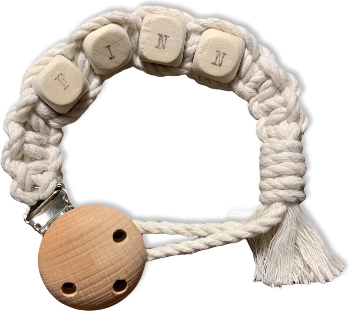 Attache tétine macramé personnalisée avec naam sur perles en bois. L’attache-tétine a une attache en bois non traité et un cordon en coton noué à la main de couleur blanc cassé. L’attache-tétine convient aux bébés à partir de 0 mois. Toutes les attaches sucettes Knoopies répondent à la norme de sécurité et sont fabriquées à la main aux Nederland avec des techniques de nouage ancestrales en macramé.