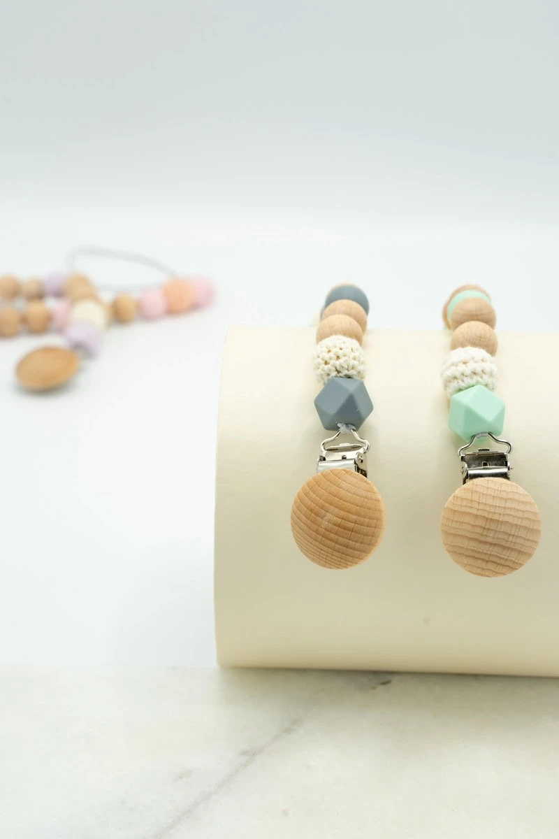 Pour la sécurité de l’enfant. L’attache tétine doit être vérifiée avant chaque utilisation. Jetez-les au premier signe de défauts ou de dommages. Ne déployez jamais l’attache-tétine. Ne l’attachez jamais à des cravates, des rubans ou des vêtements amples. Votre enfant peut s’étrangler. Utiliser uniquement sous la surveillance d’un adulte. N’utilisez pas la chaîne comme aide à la mastication. Utilisez de l’eau tiède pour nettoyer la tétine. Toutes les perles en bois sont résistantes à la sueur et à la salive, sans couleur ni substances nocives. Seuls les clips en nickel et en acier inoxydable avec trous de ventilation sont utilisés. Les cordons utilisés sont résistants à la salive et aux couleurs et ont une haute résistance à la déchirure (exigence de résistance à la déchirure de 25 Newton). Gardez à l’esprit que le bois, matériau naturel, est plus sensible à l’usure que les produits fabriqués à partir d’autres matériaux. L’abrasion de la couleur peut (mais n’est pas obligatoire) se produire en rapport avec la salive. Les peintures et vernis hydrosolubles utilisés sont non toxiques (sans danger pour les aliments) et il n’y a donc aucun risque pour l’enfant. NE PAS mettre de produits en bois dans le stérilisateur, sous l’eau courante, au lave-vaisselle ou à la machine à laver.