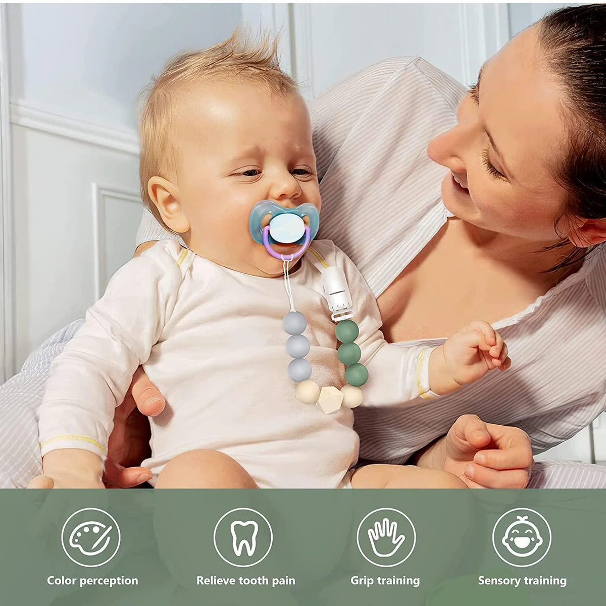 • Ne perdez jamais les tétines : l’attache en silicone de la tétine aide le nouveau parent à garder un œil sur ces garçons et à les empêcher de tomber par terre lorsque bébé déplace ses tétines dans la pièce, les restaurants, les matchs de football, le camping, etc.