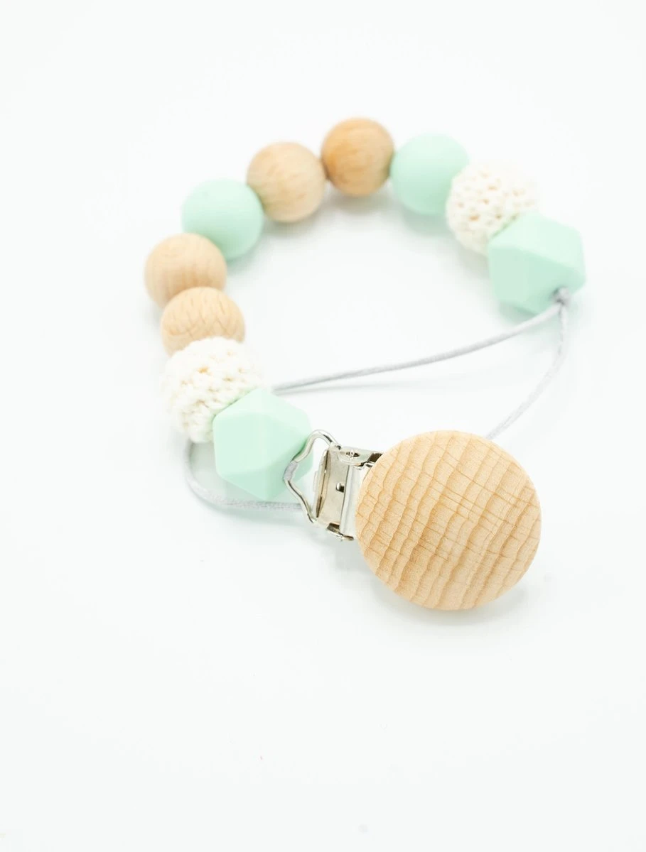 Pour la sécurité de l’enfant. L’attache tétine doit être vérifiée avant chaque utilisation. Jetez-les au premier signe de défauts ou de dommages. Ne déployez jamais l’attache-tétine. Ne l’attachez jamais à des cravates, des rubans ou des vêtements amples. Votre enfant peut s’étrangler. Utiliser uniquement sous la surveillance d’un adulte. N’utilisez pas la chaîne comme aide à la mastication. Utilisez de l’eau tiède pour nettoyer la tétine. Toutes les perles en bois sont résistantes à la sueur et à la salive, sans couleur ni substances nocives. Seuls les clips en nickel et en acier inoxydable avec trous de ventilation sont utilisés. Les cordons utilisés sont résistants à la salive et aux couleurs et ont une haute résistance à la déchirure (exigence de résistance à la déchirure de 25 Newton). Gardez à l’esprit que le bois, matériau naturel, est plus sensible à l’usure que les produits fabriqués à partir d’autres matériaux. L’abrasion de la couleur peut (mais n’est pas obligatoire) se produire en rapport avec la salive. Les peintures et vernis hydrosolubles utilisés sont non toxiques (sans danger pour les aliments) et il n’y a donc aucun risque pour l’enfant. NE PAS mettre de produits en bois dans le stérilisateur, sous l’eau courante, au lave-vaisselle ou à la machine à laver.