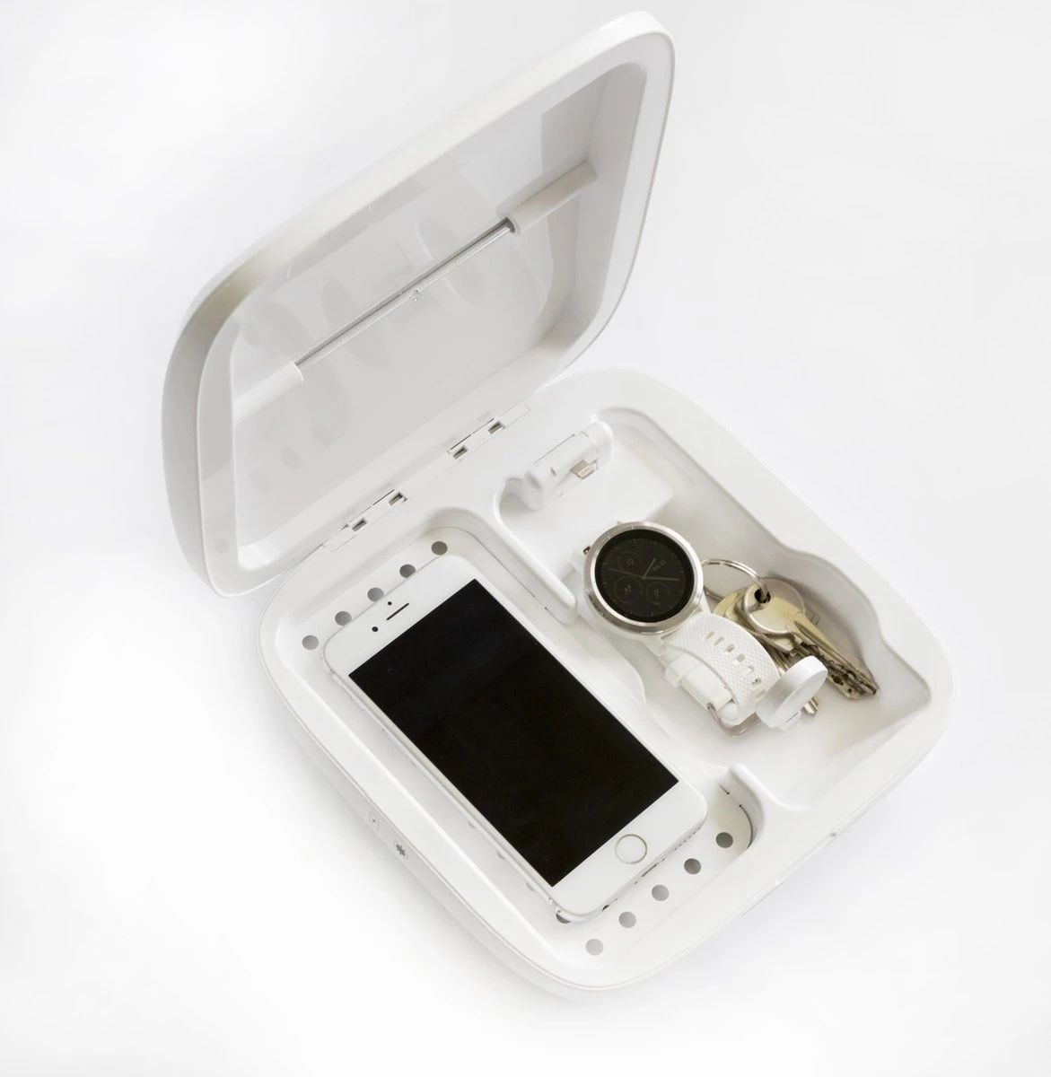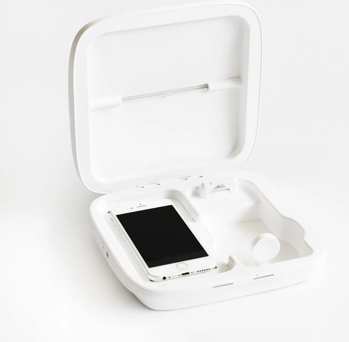 Ce qui rend cette boîte de stérilisateur unique, c’est que les téléphones, les pods pneumatiques et les montres intelligentes peuvent être désinfectés et chargés en même temps. Vous placez le matériel dans la boîte, appuyez sur le bouton et la boîte s’assure que votre matériel sortira chargé et stérilisé: simple, pratique et rapide. Notez que le téléphone doit être adapté au chargement sans fil.