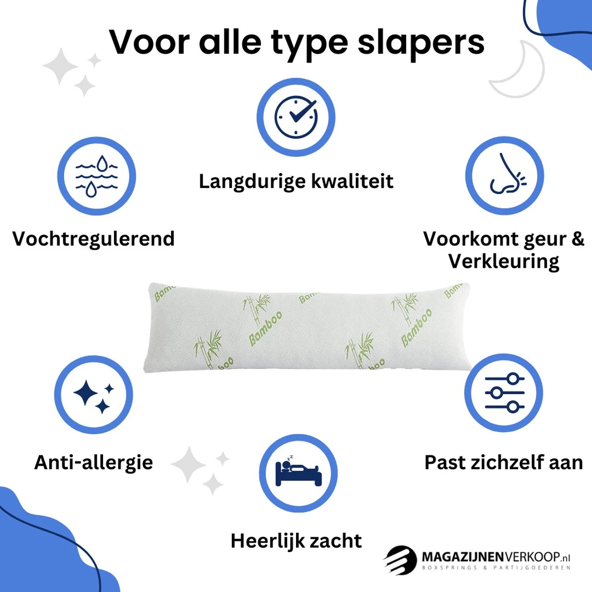 Cet kussen a un rembourrage unique. Un côté est rempli de flocons de mousse à mémoire de forme et l’autre côté de fibres de polyester souples. Cela vous donne deux duretés différentes dans un seul kussen. La mousse à mémoire offre un soutien et les fibres de balle sont douces. Si vous avez besoin de plus de soutien, choisissez le côté mousse à mémoire de forme. Si vous ne voulez pas trop bien dormir, choisissez le côté avec les fibres boules.