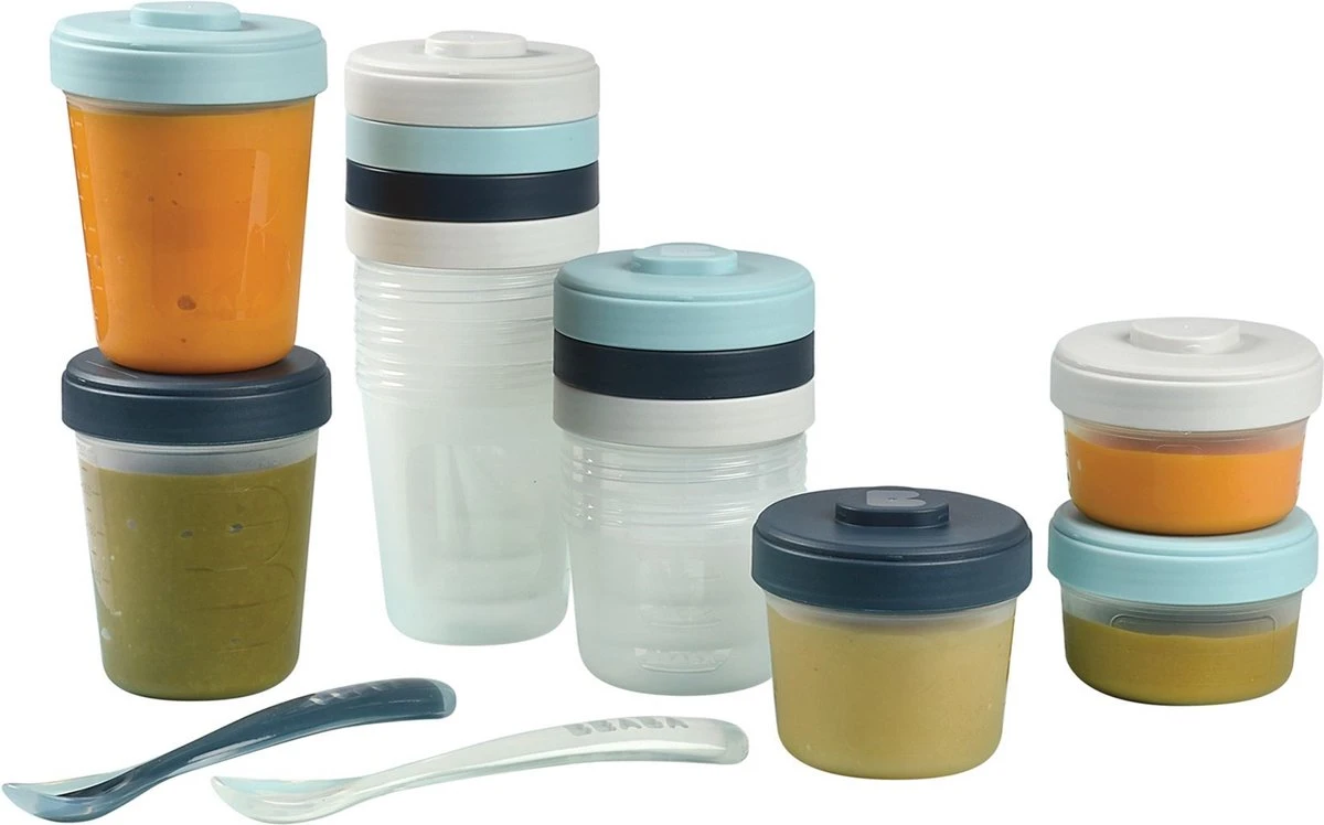 Ces 12 jolis bocaux de conservation et 2 cuillères (convient à partir de 4 mois) de la marque française BéaBa sont adaptés pour conserver, congeler ou décongeler les aliments de bébé. Vous pouvez empiler les bocaux au congélateur, ils sont également hermétiques et étanches. Ils peuvent également être utilisés en toute sécurité au micro-ondes pour décongeler ! C’est si facile !