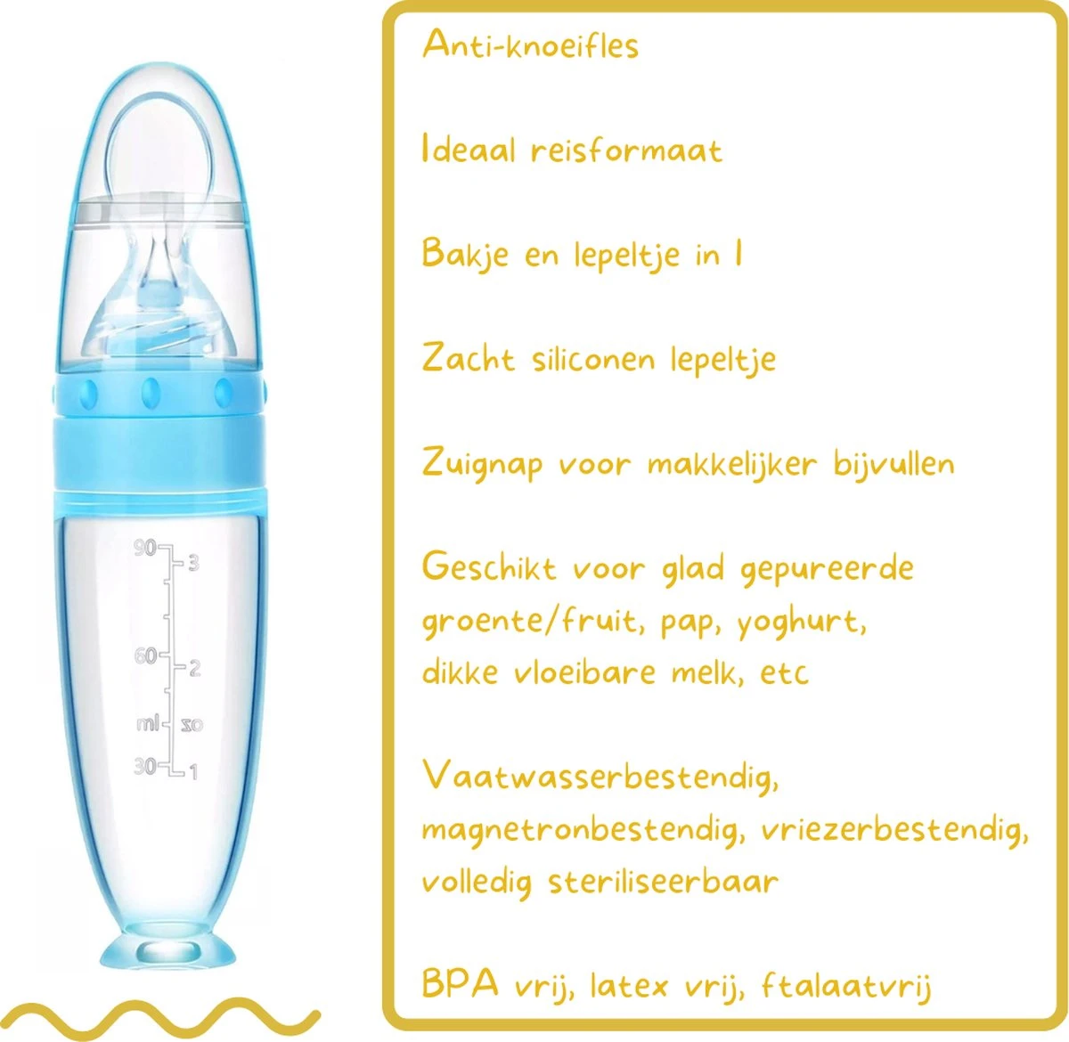 Votre tout-petit est-il prêt pour les premières bouchées ? Alors découvrez cet outil pratique ! Ce biberon résistant aux éclaboussures est un moyen facile, rapide et hygiénique de nourrir votre bébé. Un bol et une cuillère séparés appartiennent au passé, cette bouteille sert les deux ! Le fond de la bouteille est muni d’une ventouse, vous pouvez donc mettre la bouteille debout pendant le remplissage ! Ce produit peut être utilisé pour la purée de fruits, la purée de légumes, le yaourt, la bouillie, etc. et constitue un excellent moyen de passer de l’allaitement à la nourriture solide.