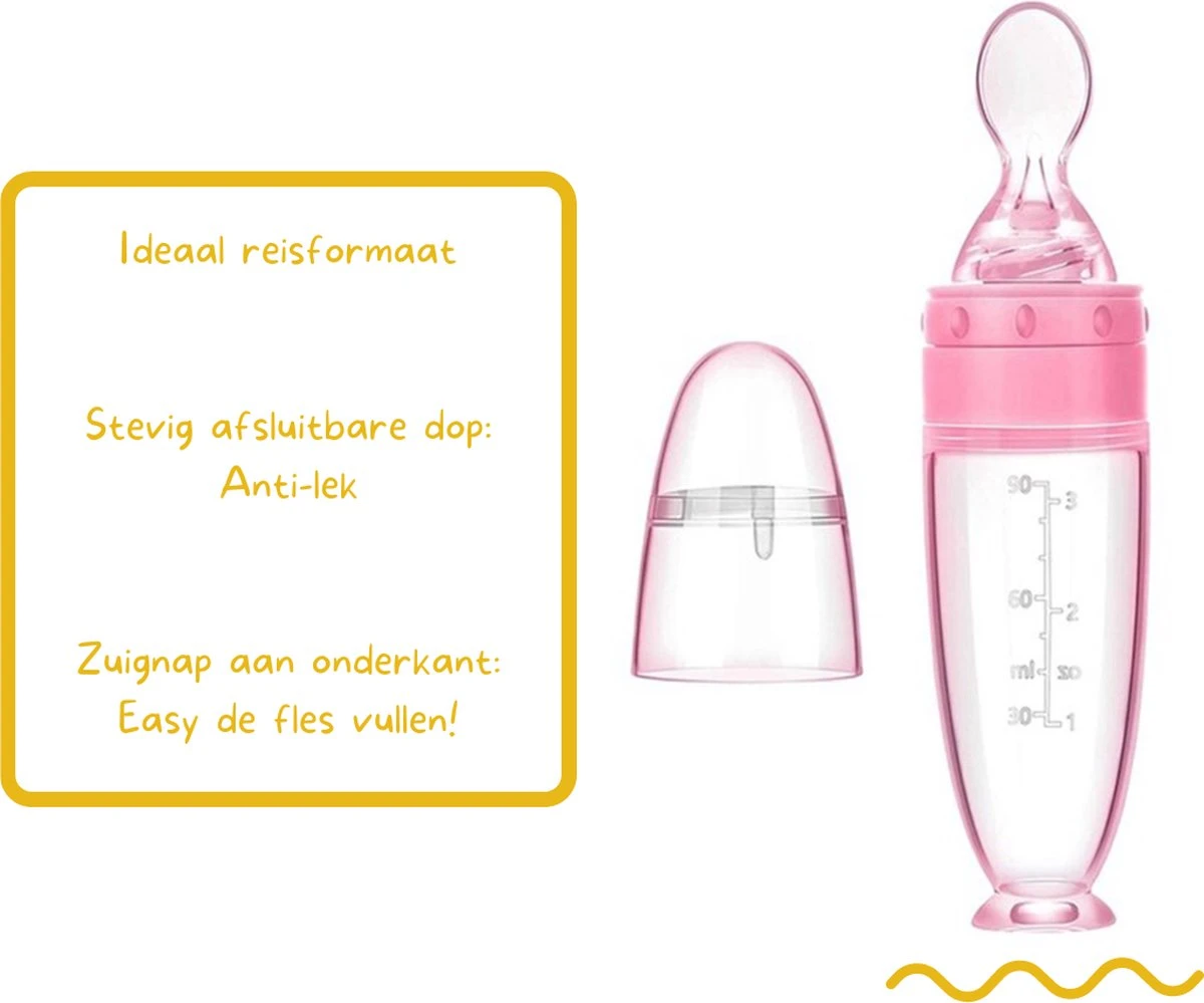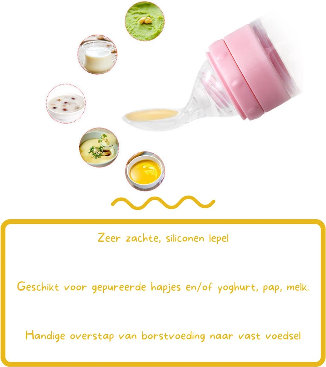 Votre tout-petit est-il prêt pour les premières bouchées ? Alors découvrez cet outil pratique ! Ce biberon résistant aux éclaboussures est un moyen facile, rapide et hygiénique de nourrir votre bébé. Un bol et une cuillère séparés appartiennent au passé, cette bouteille sert les deux ! Le fond de la bouteille est muni d’une ventouse, vous pouvez donc mettre la bouteille debout pendant le remplissage ! Ce produit peut être utilisé pour la purée de fruits, la purée de légumes, le yaourt, la bouillie, etc. et constitue un excellent moyen de passer de l’allaitement à la nourriture solide.
