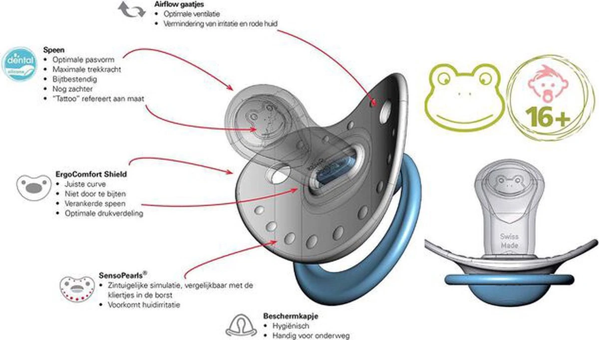 Le « tatouage » dans la tétine est tout à fait unique. Un animal est tatoué dans la tétine qui correspond à la boîte. Cela facilite l’achat de la même tétine en magasin. Le tatouage est visible pour vous mais pas palpable pour l’enfant.