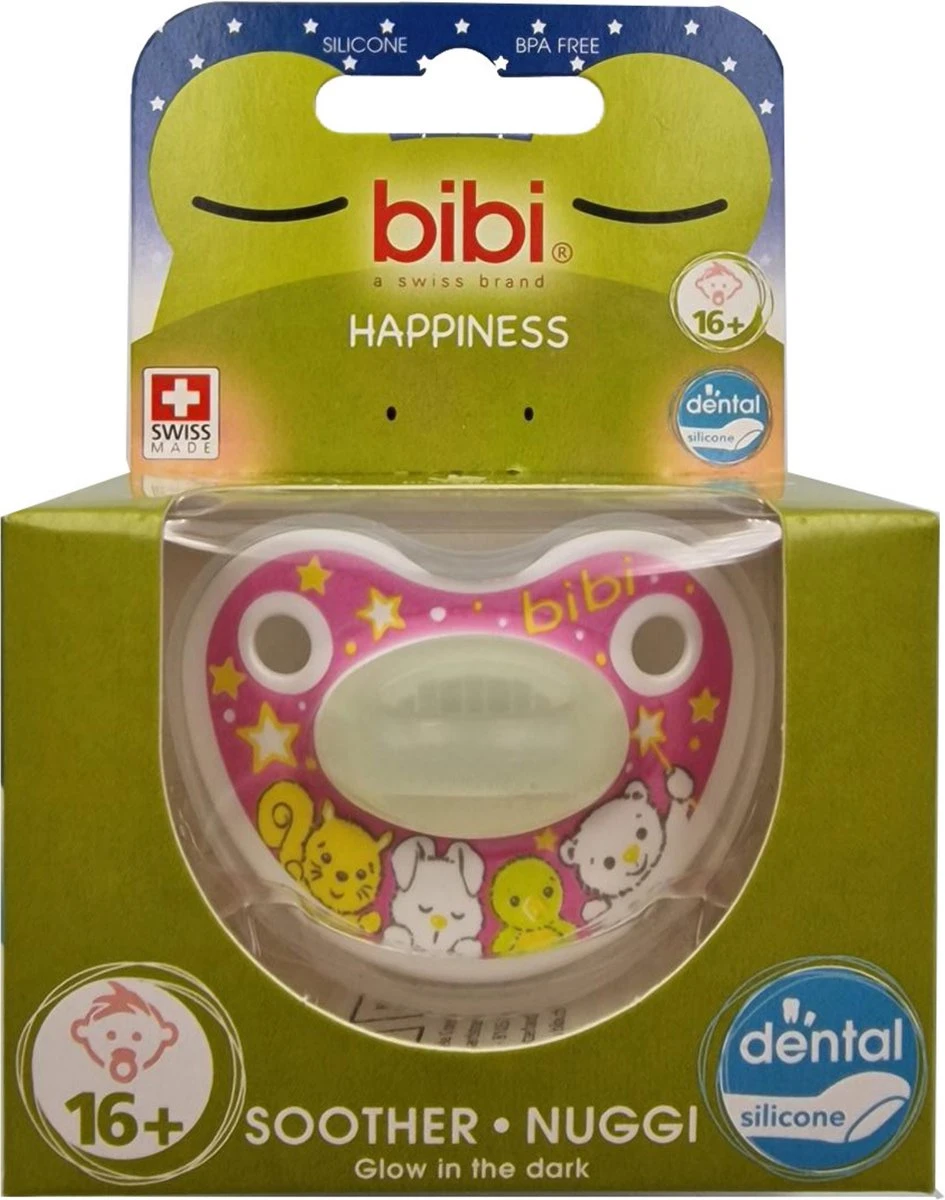 Convient pour 6-16 mois avec effet Glow in the Dark (facile à trouver la tétine sans allumer la lumière). Sans bague, pour la nuit; la tétine tombe moins facilement. Conçu et fabriqué en Suisse.