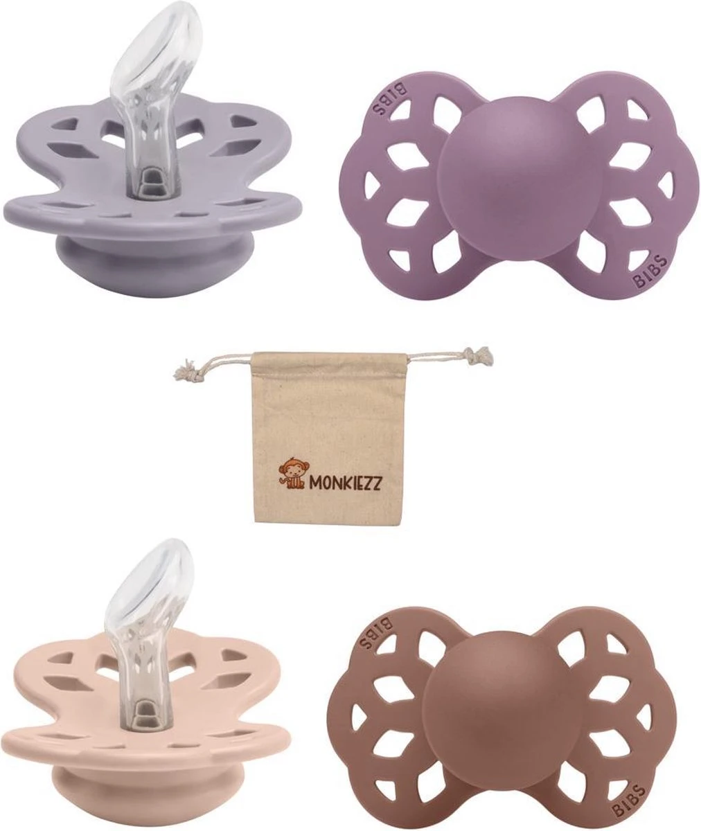 Blisters Bibs Infinity Sucettes Dental Anatomique 0-6 Mois| Set 4 Pièces|Mauve, Gris Fossile, Marmotte, Blush à Joues| + Etui Tétine Monkiezz| Orthodontique| Anatomiquement| Taille 1