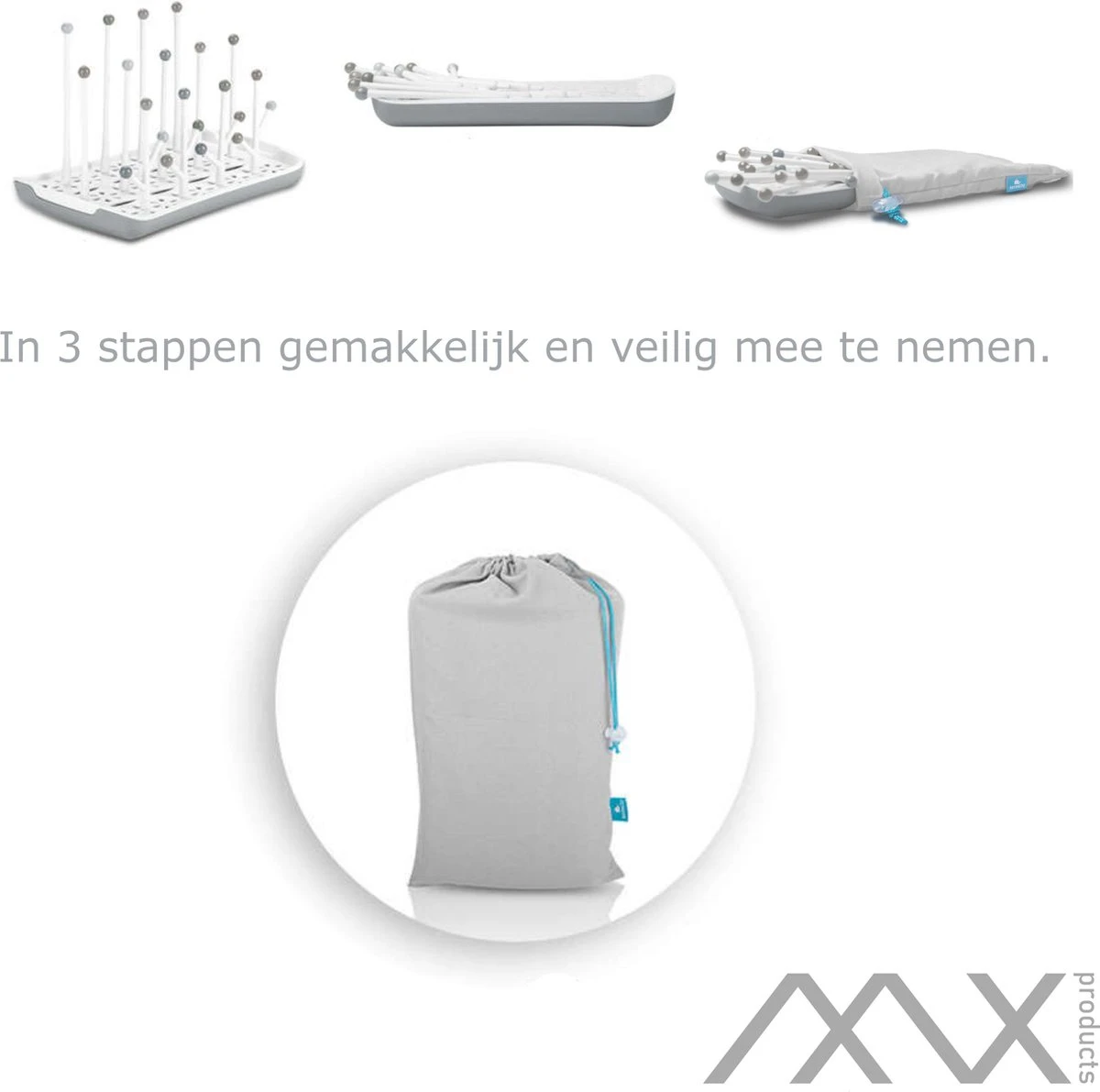 Le casier à bouteilles peut être agencé selon eigen wens , en plaçant les broches. Ce support est également facile à ranger dans le sac de rangement fourni. Vous pouvez facilement assembler et démonter le support de séchage des bouteilles. En raison de la conception compacte, le stockage prend peu de place.