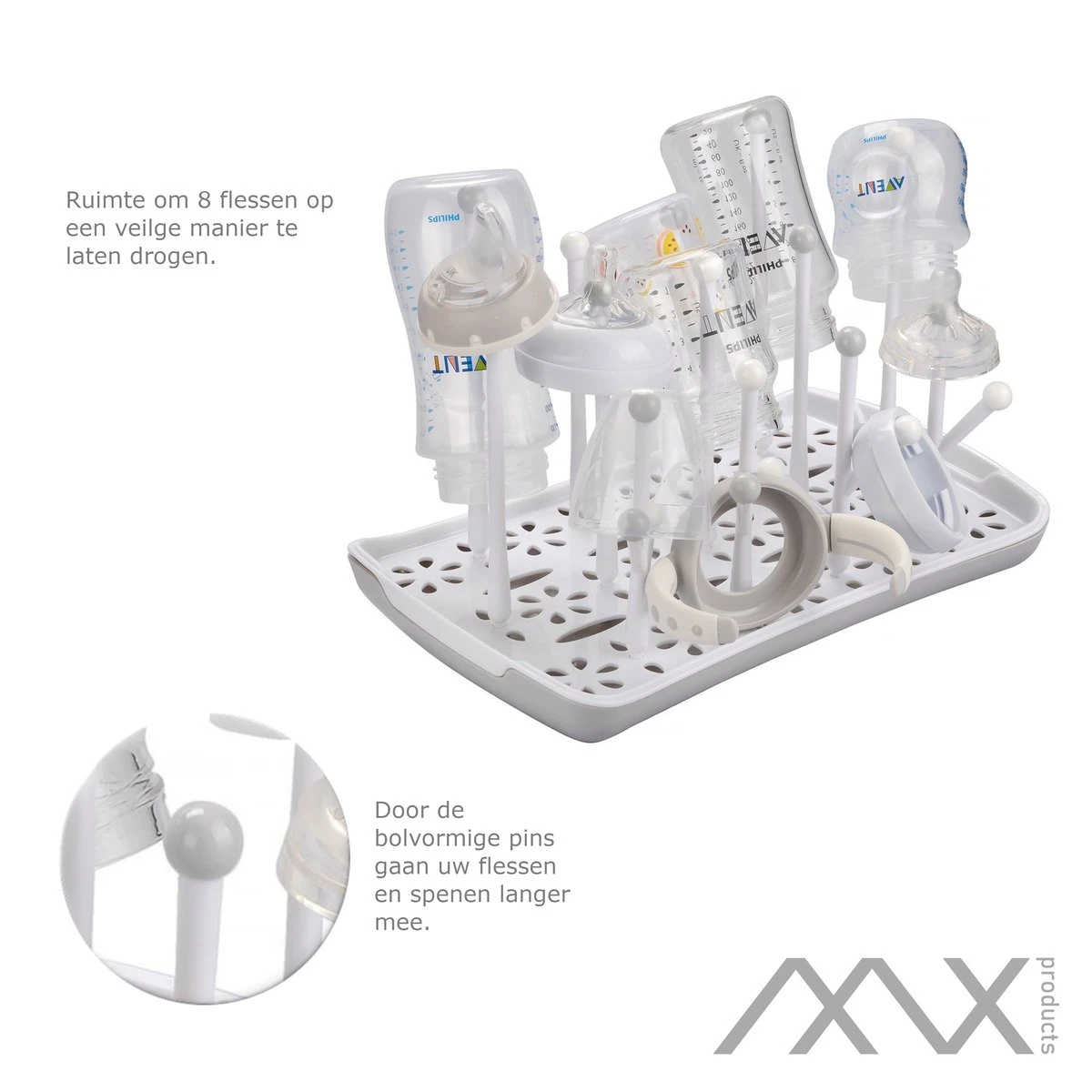 Ce séchoir à biberons de Mix Products est spécialement conçu pour sécher les biberons et accessoires de manière sûre après le nettoyage et/ou l’ébullition (stérilisation). Cela empêche la croissance des bactéries. Avec ce séchoir à biberons, sécher les biberons entre les plats quotidiens ou en vrac sur le comptoir est réelpassé. Le séchoir offre de la place pour plusieurs biberons et/ou tétines. Grâce au bac d’égouttage amoviblevous pouvez facilement drainer l’excès d’eau. La conception amovible vous permet de déterminer vous-même la disposition des broches.