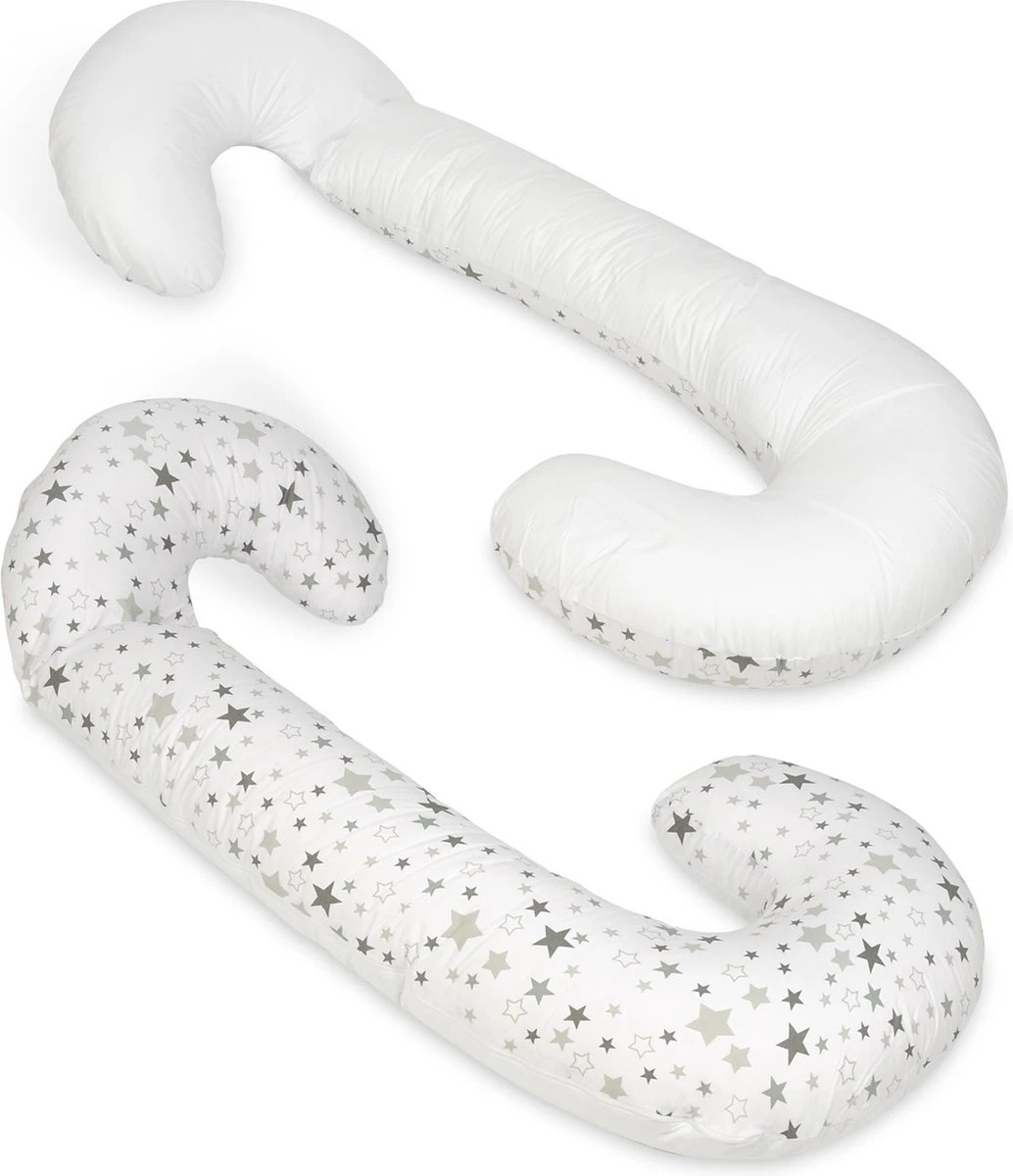 Un coussin d’allaitement 100 % coton avec des étoiles blanches/grises sur blanc – couleurs blanches de Vikingchoice. Le coussin de soutien peut être utilisé dans plusieurs situations et a une forme en C.