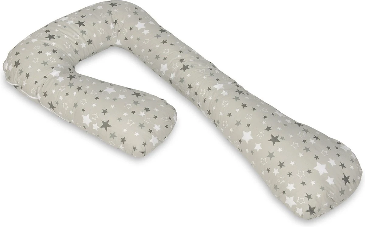 Un coussin d’allaitement 100% coton avec des étoiles blanches/grises sur des couleurs grises de Vikingchoice. Le coussin de soutien peut être utilisé dans plusieurs situations et a une forme en U.