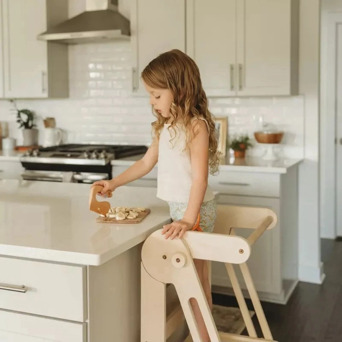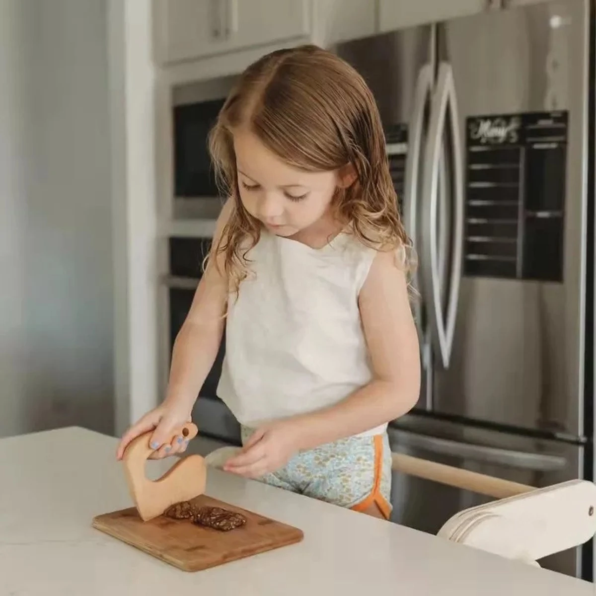Ce couteau est fait de bois massif avec des bords polis. La lame est suffisamment tranchante pour couper les fruits, les légumes et le pain, mais reste sans danger pour les enfants.