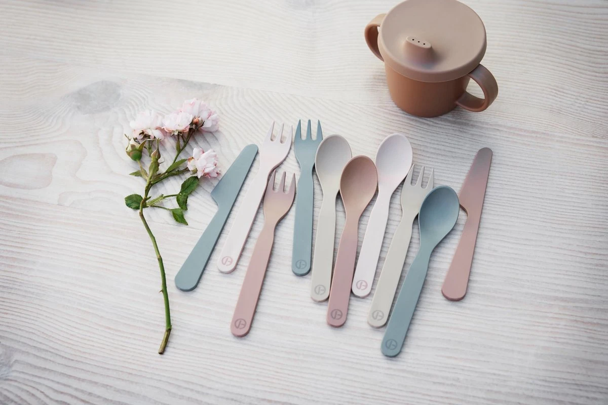 Couverts pour enfants en bioplastique, fabriqués à partir de matières végétales recyclées.