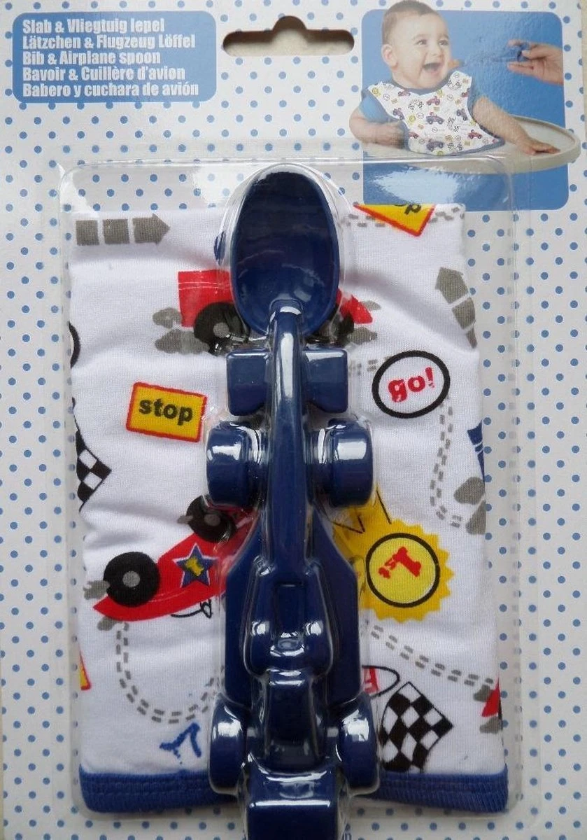 Cuillère bleue d’avion de voiture de course + bavoir assorti pour bébé tout-petit