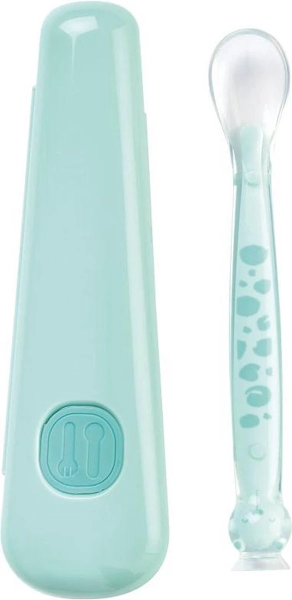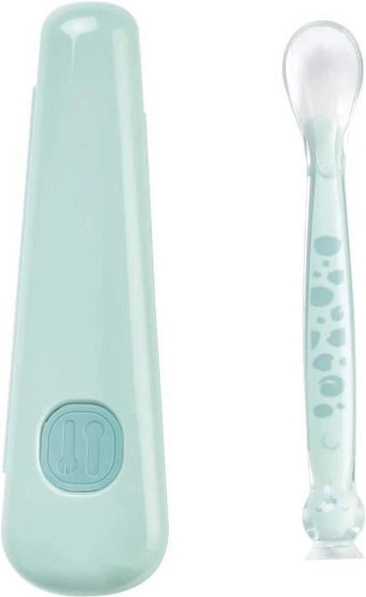 Cette cuillère est idéale pour les premières bouchées de votre enfant. Le matériau souple n’endommage pas les gencives et vous pouvez l’emporter de manière hygiénique avec vous dans le support. De plus, la cuillère est équipée d’une ventouse pour un rangement pratique.