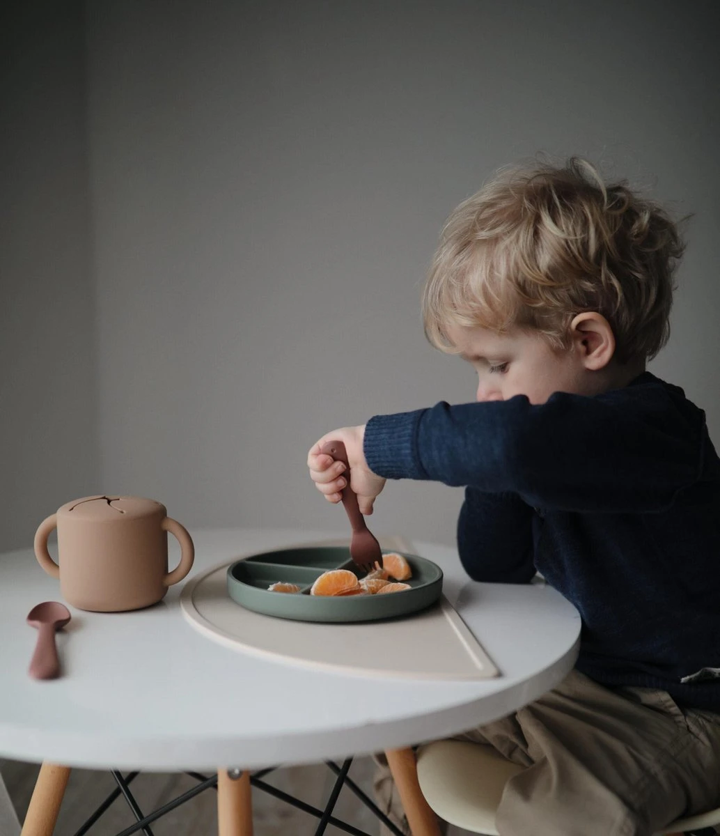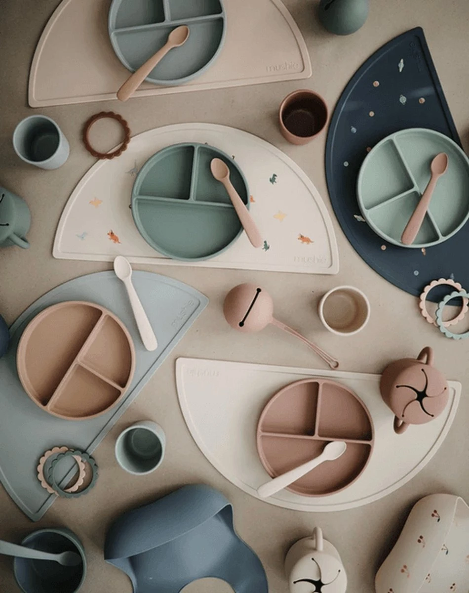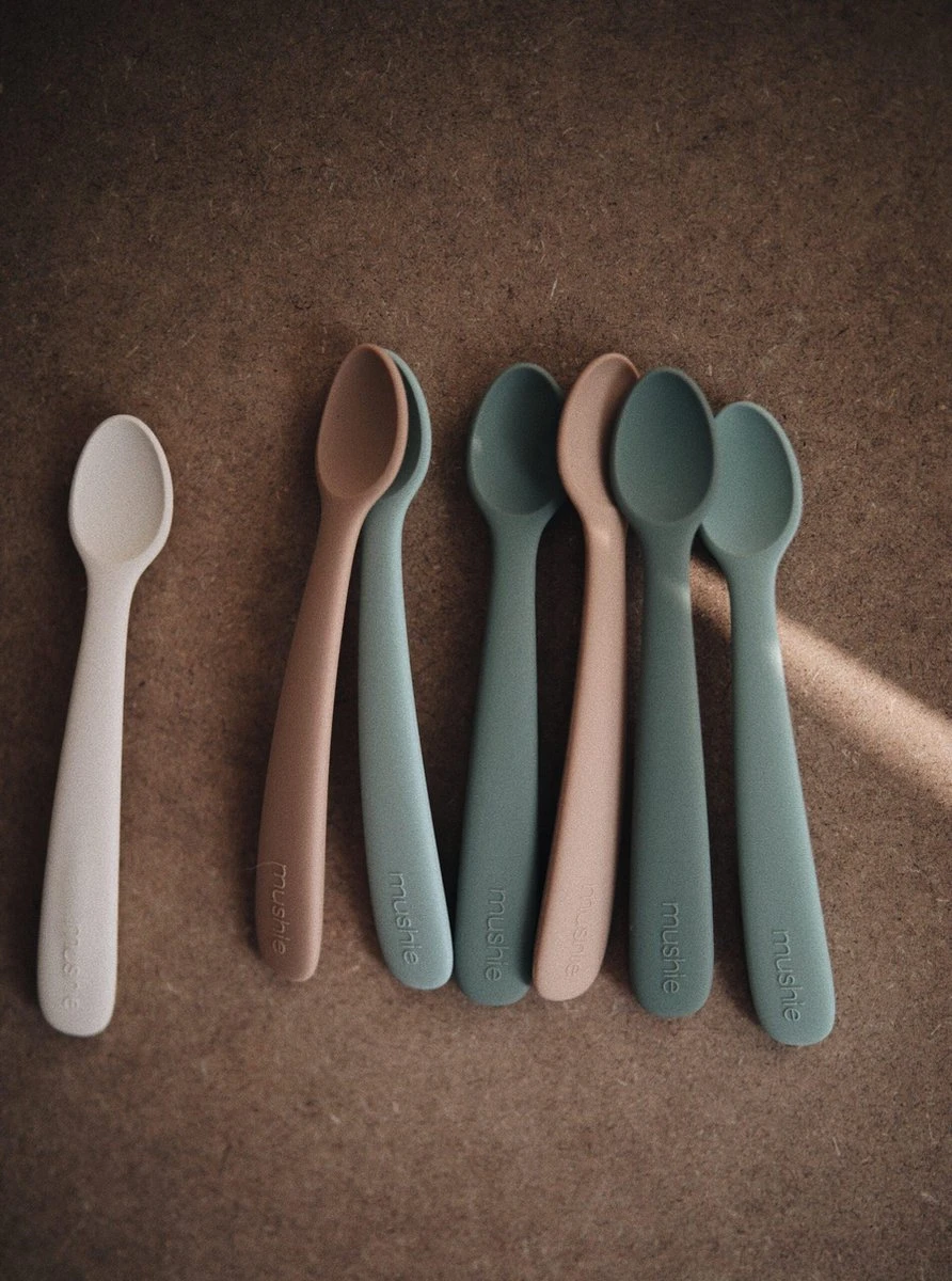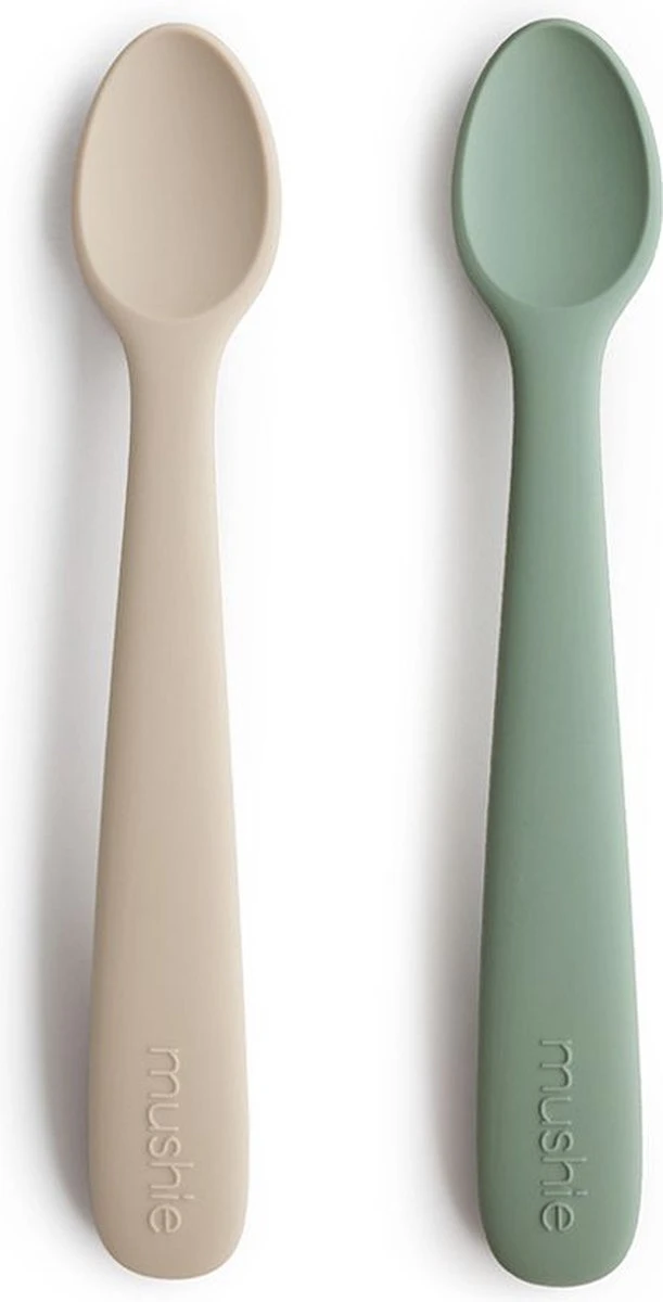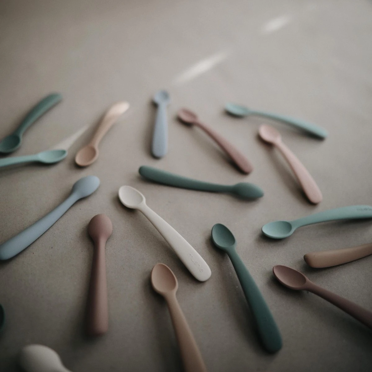 Un ensemble de cuillères pour bébé de Mushie, deux cuillères en silicone pour transformer les premières bouchées en fête. Les couverts pour enfants sont en silicone, ce qui protège les dents de la pénétration.