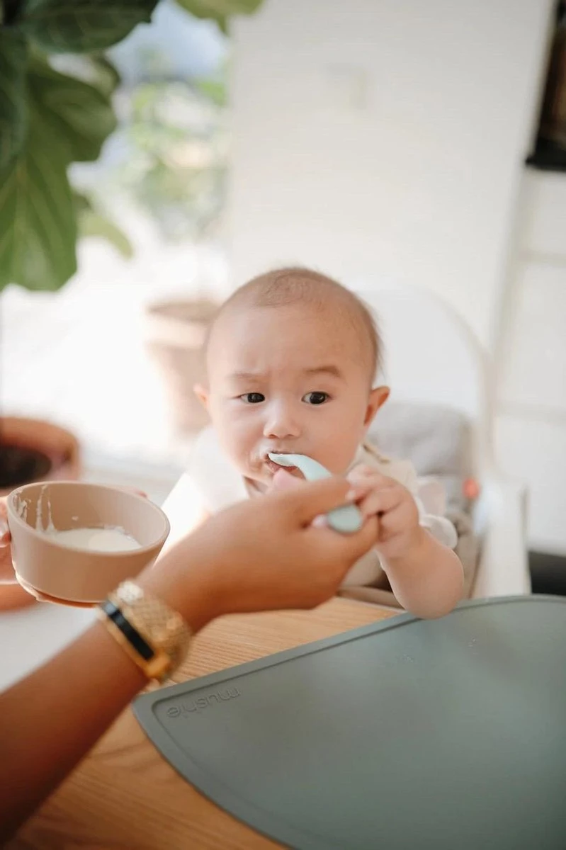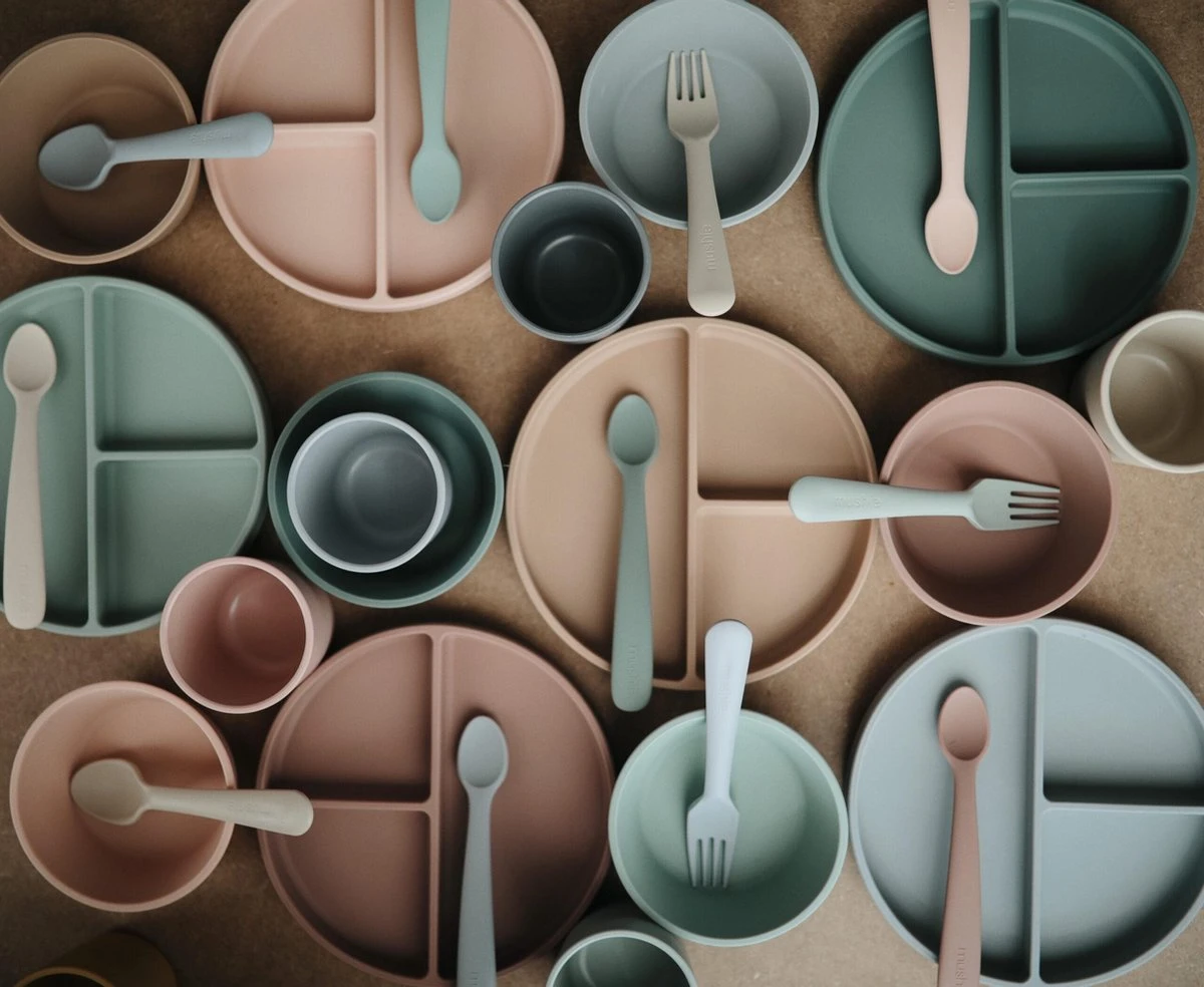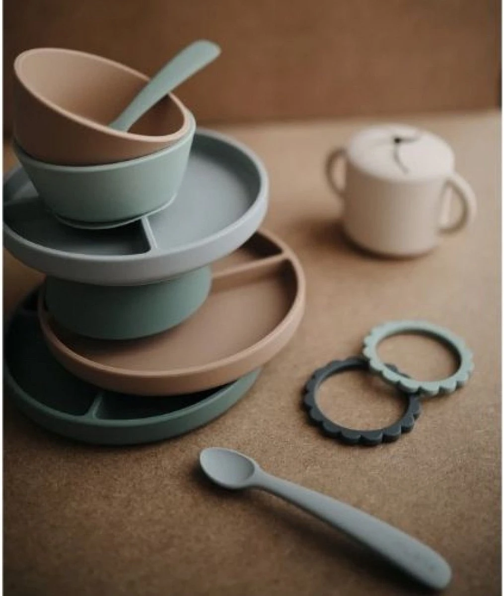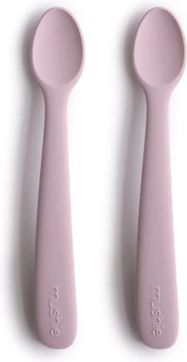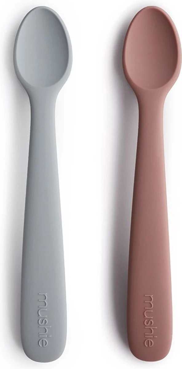 Un ensemble de cuillères pour bébé de Mushie, deux cuillères en silicone pour transformer les premières bouchées en fête. Les couverts pour enfants sont en silicone, ce qui protège les dents de la pénétration.