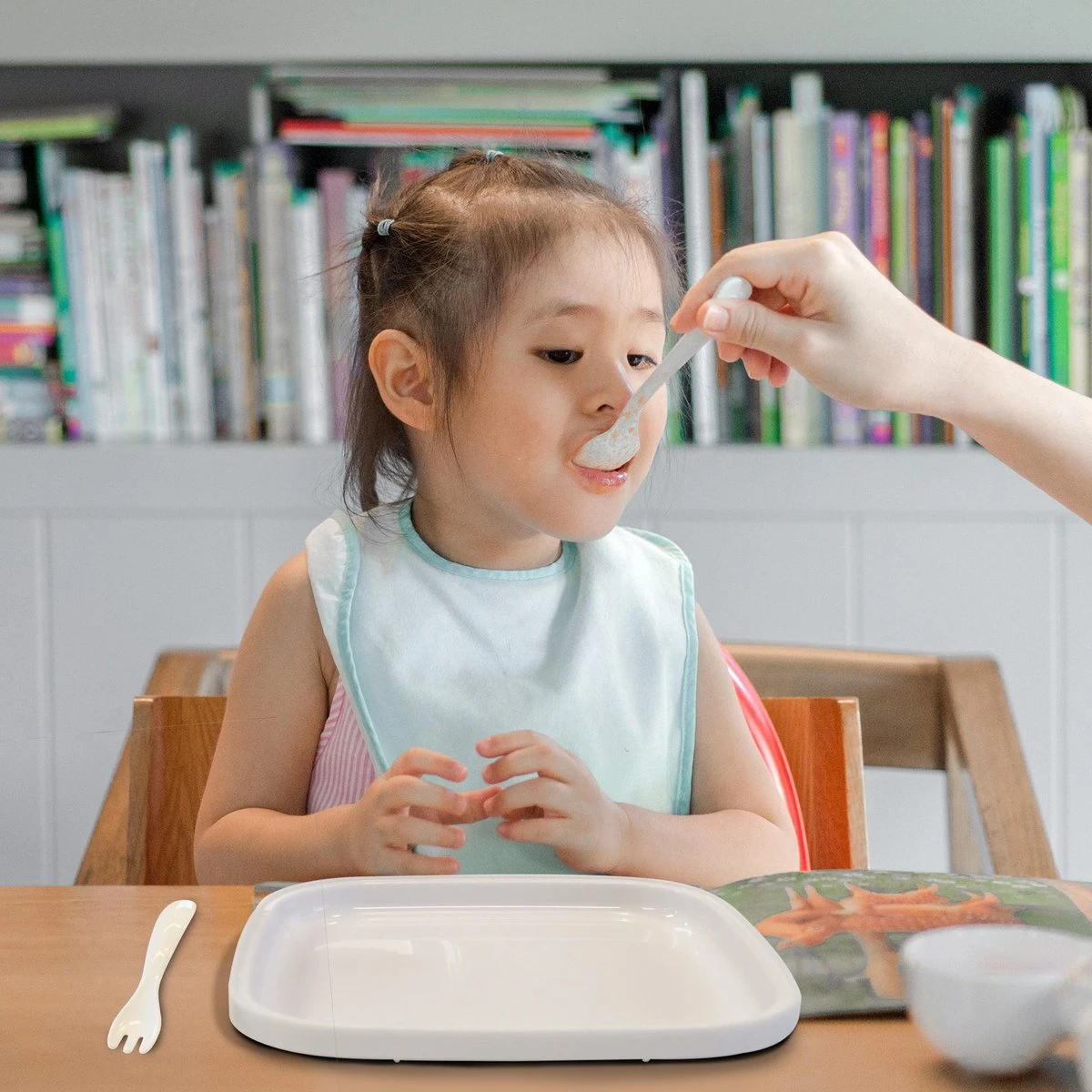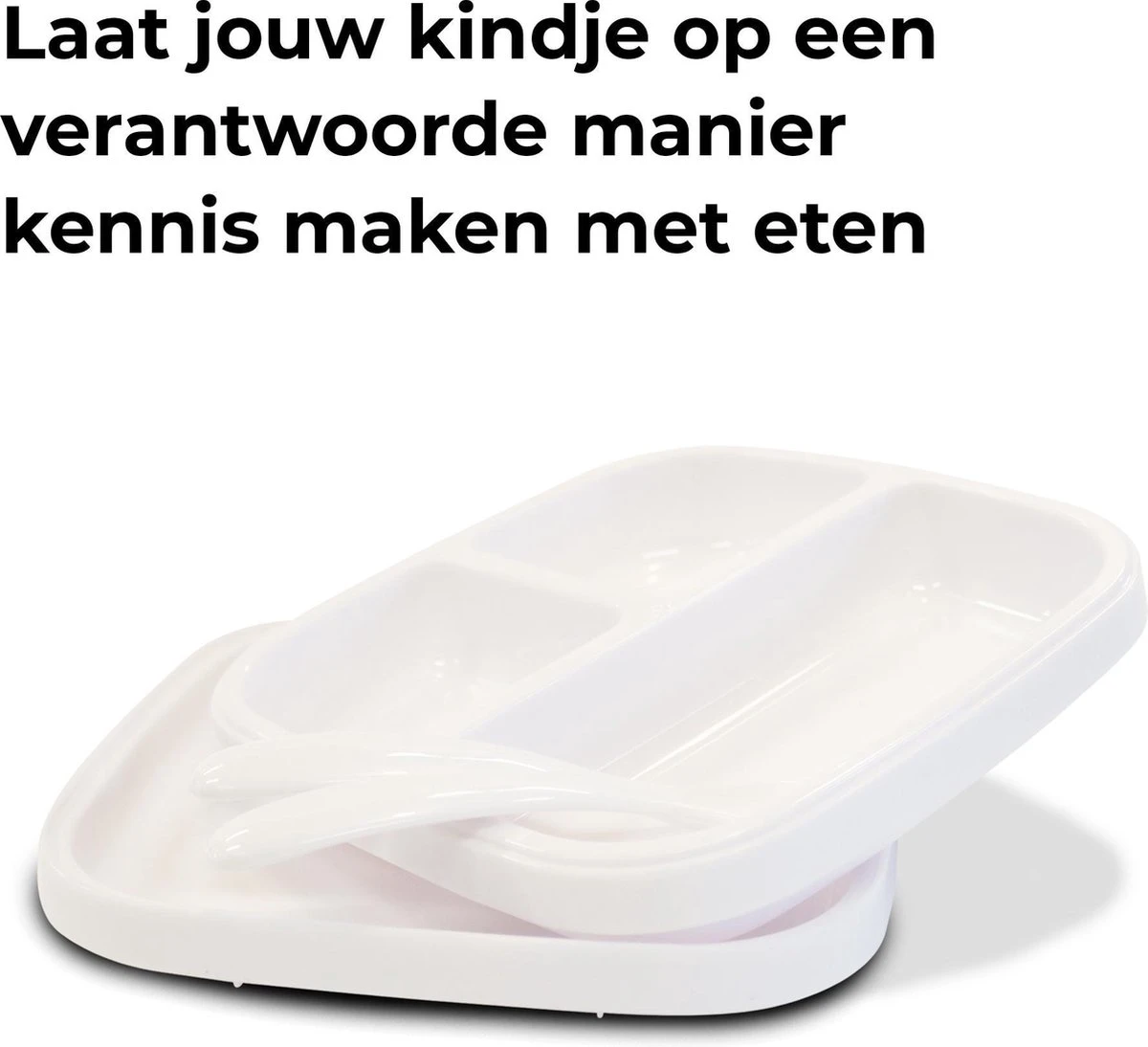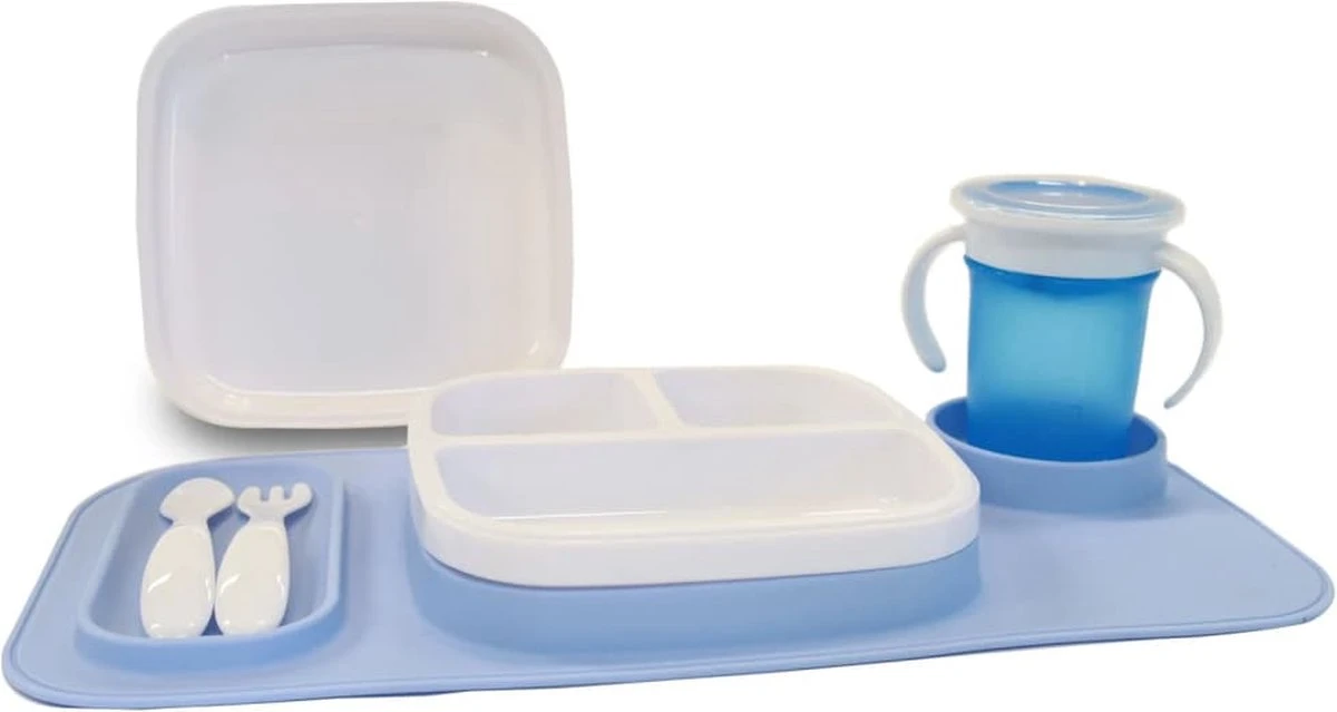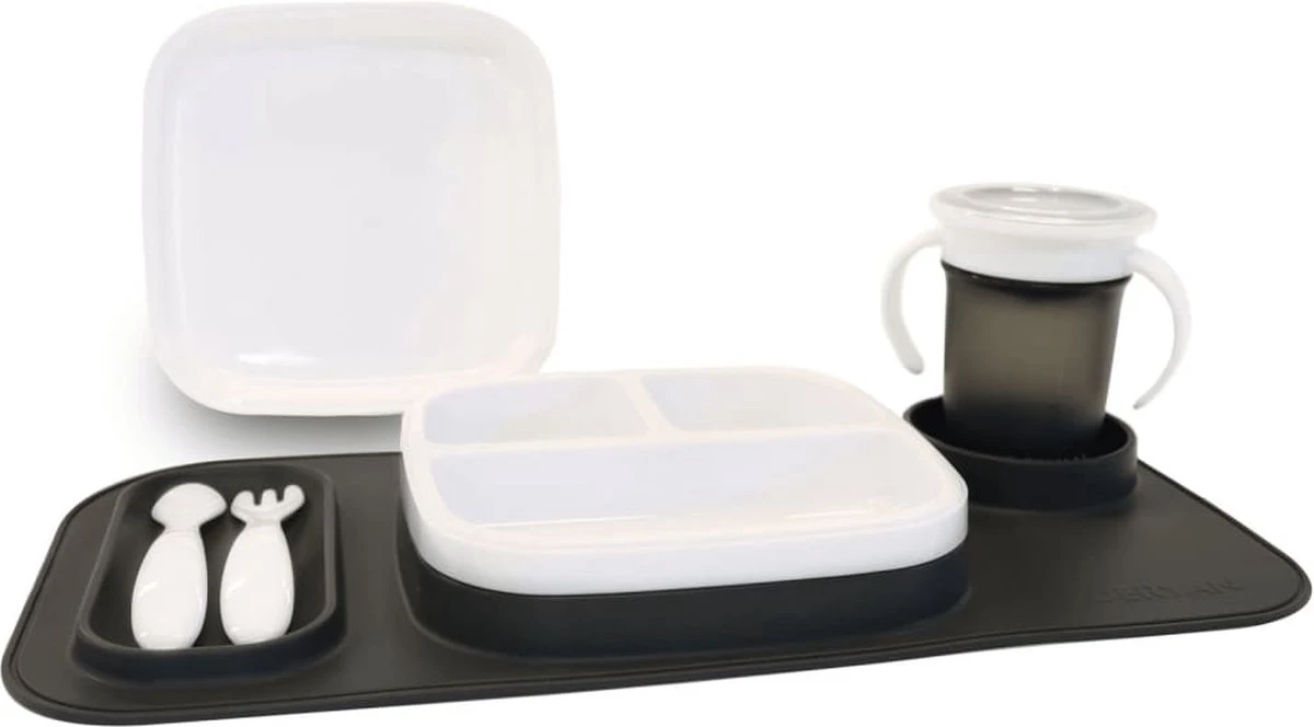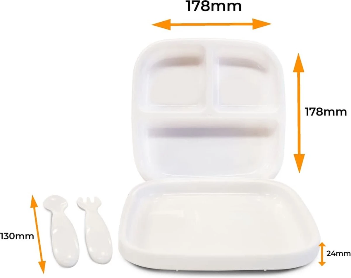 Set de la plaque Quuby se compose de deux plaques; une assiette normale et une avec trois compartiments différents. Cela comprend également une fourchette et une cuillère.