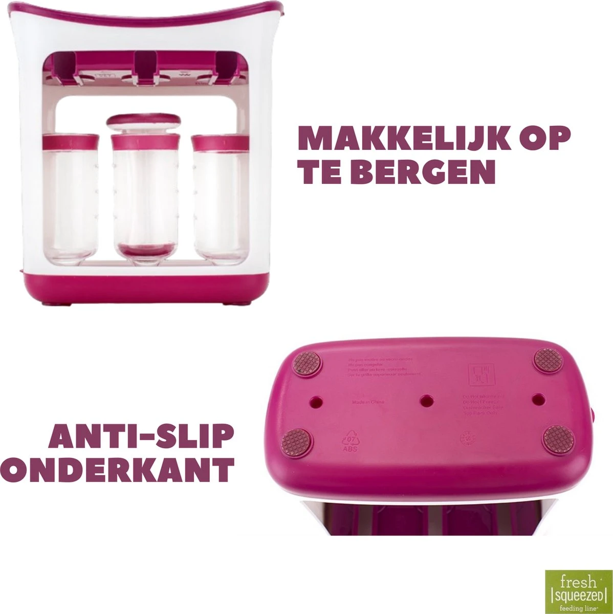 Les clients de Fresh Squeezed l’utilisent principalement pour fabriquer des sachets d’aliments pour bébés. Avec Fresh Squeezed, vous pouvez mélanger et préparer vous-même les aliments pour bébés, de sorte que vous sachiez toujours exactement ce que votre enfant mange ou boit. Les sachets compressibles facilitent grandement l’administration de la nourriture.