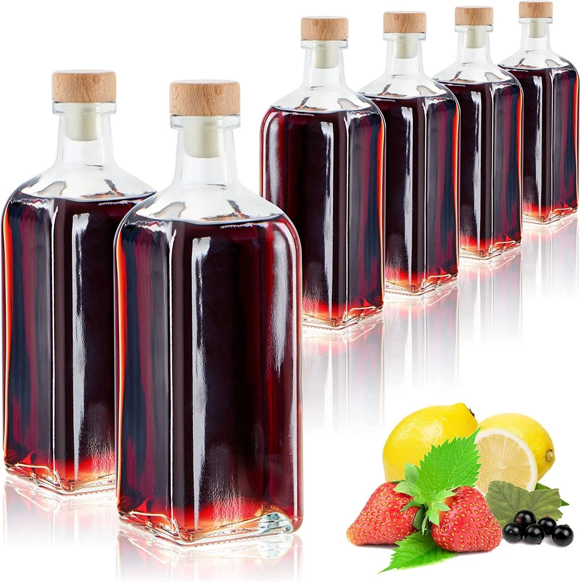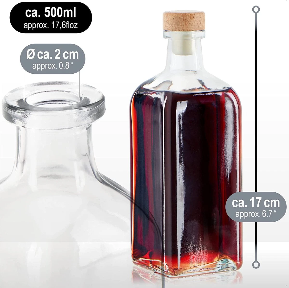 - CONTENU DE LA LIVRAISON : 6x flacon en verre avec bouchon en plastique // dimensions : environ 17 x 7,5 x 7,5 cm (hauteur x largeur x profondeur) // ouverture du flacon : Ø 2 cm // contenu : environ 545 ml // quantité de remplissage recommandée : environ 500 ml // Matériau : verre, bois, plastique // Couleur : transparent, marron