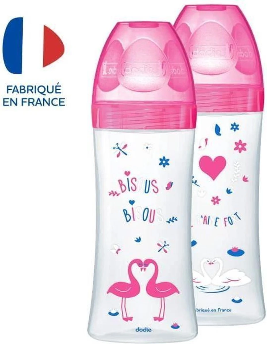 DODIE Box X2 Biberons Sensation + 330 Ml FUSHIA CYGNES – +6 Mois – Tétine Plate – Flow 3