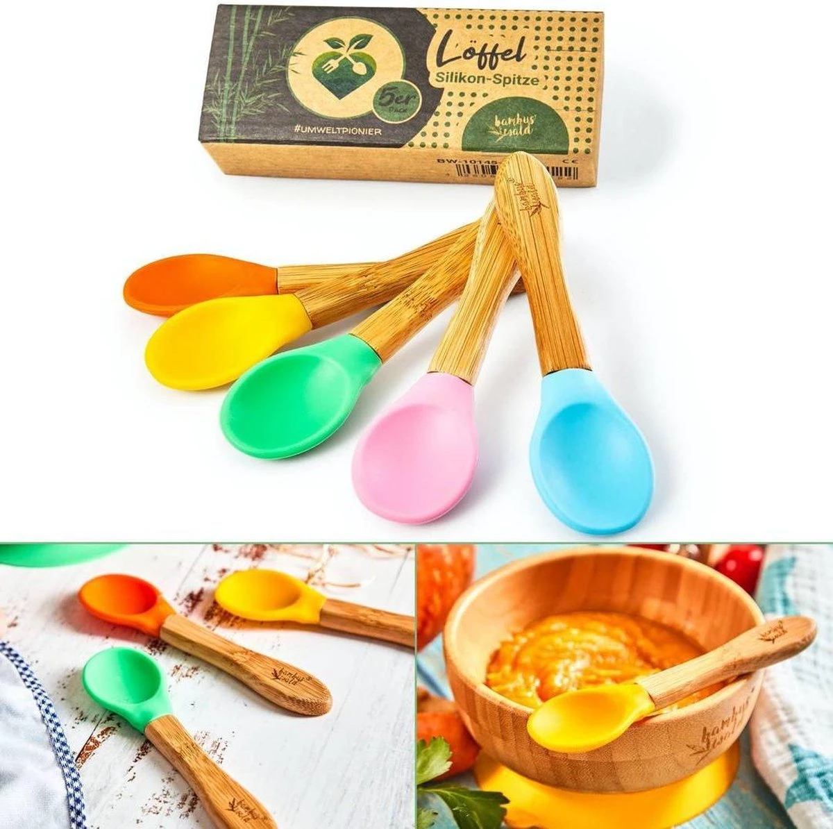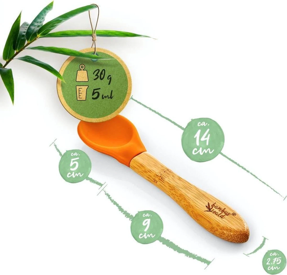 Les cuillères en bois en bambou et silicone assurent la sécurité de votre bébé à tous égards: Vous vous protégez ainsi que votre enfant des toxines et éliminez tout risque de blessure. Les bords arrondis avec une surface lisse et polie et la tête en silicone souple et flexible garantissent que même si les dents passent, il n’y a pas d’inconfort. Les couverts pour enfants ne se fendillent pas, ne se cassent pas et ne se plient pas, de sorte que pratiquement aucun dommage ne se produit. Le contrôle qualité garantit que les couverts peuvent être utilisés à 100% pour un contact direct avec les aliments. C’est-à-dire qu’ils ne dégagent ni odeur ni goût. Vous pouvez utiliser la cuillère pour enfants tiède pour les aliments froids, solides et liquides.