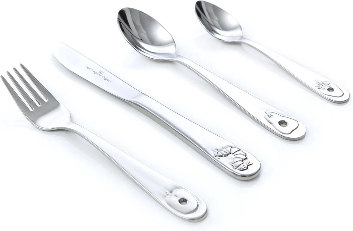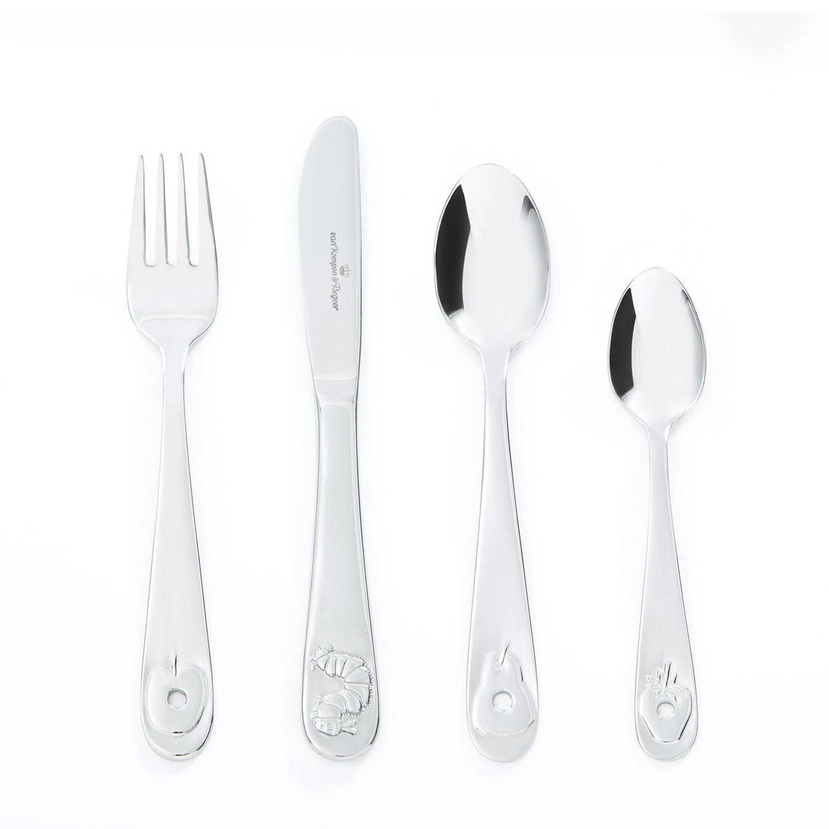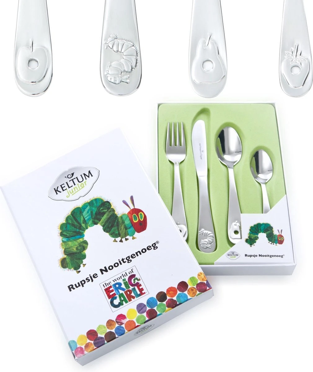 Rupsje Nooitgenoeg est un couvert pour enfants en acier inoxydable 18/10 de Keltum et disponible dans un ensemble de 4 pièces.
