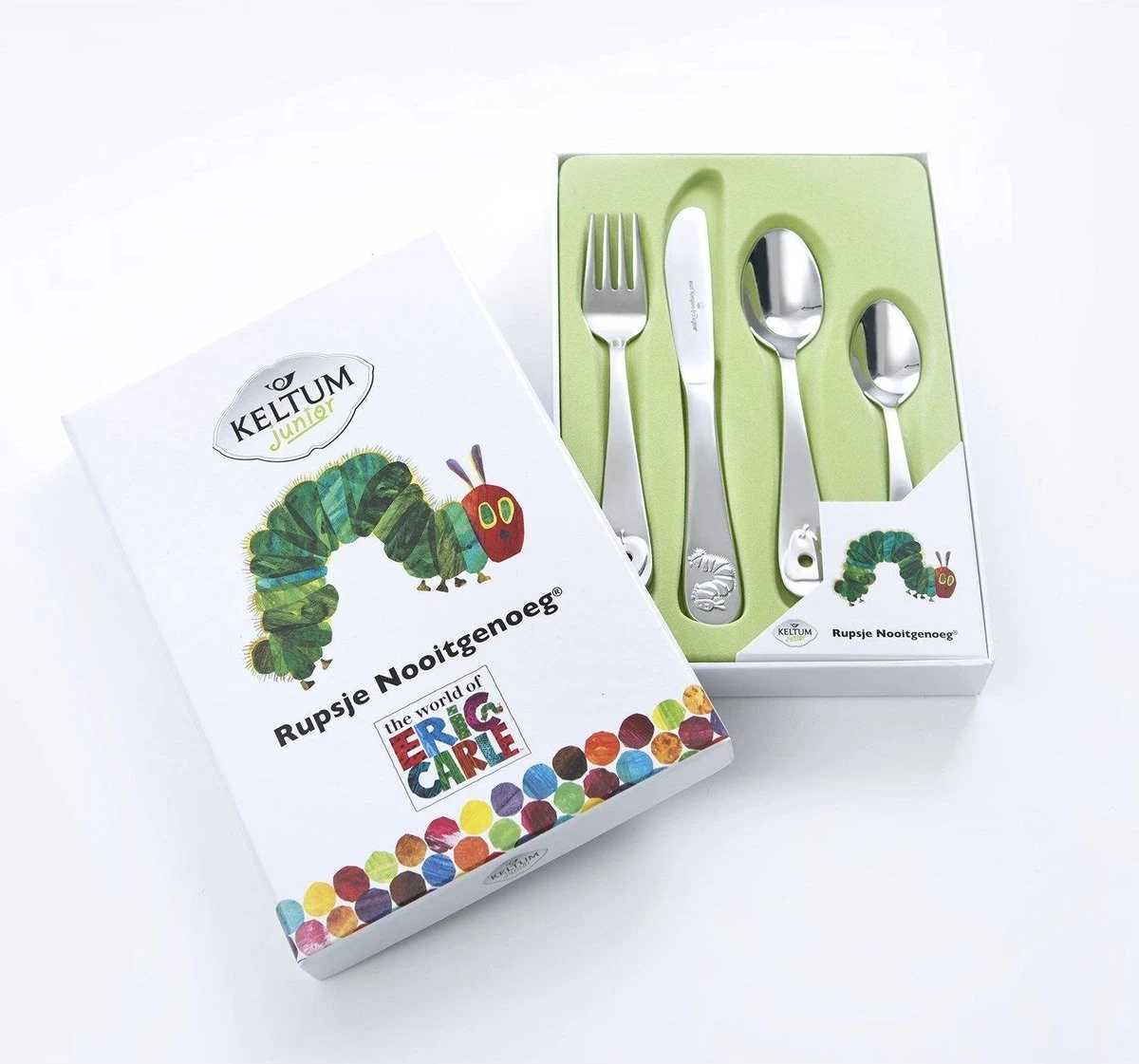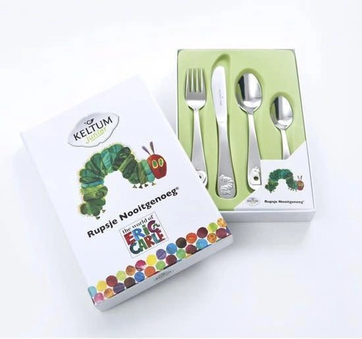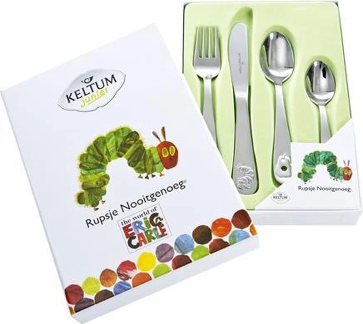 Rupsje Nooitgenoeg est un couvert pour enfants en acier inoxydable 18/10 de Keltum et disponible dans un ensemble de 4 pièces.