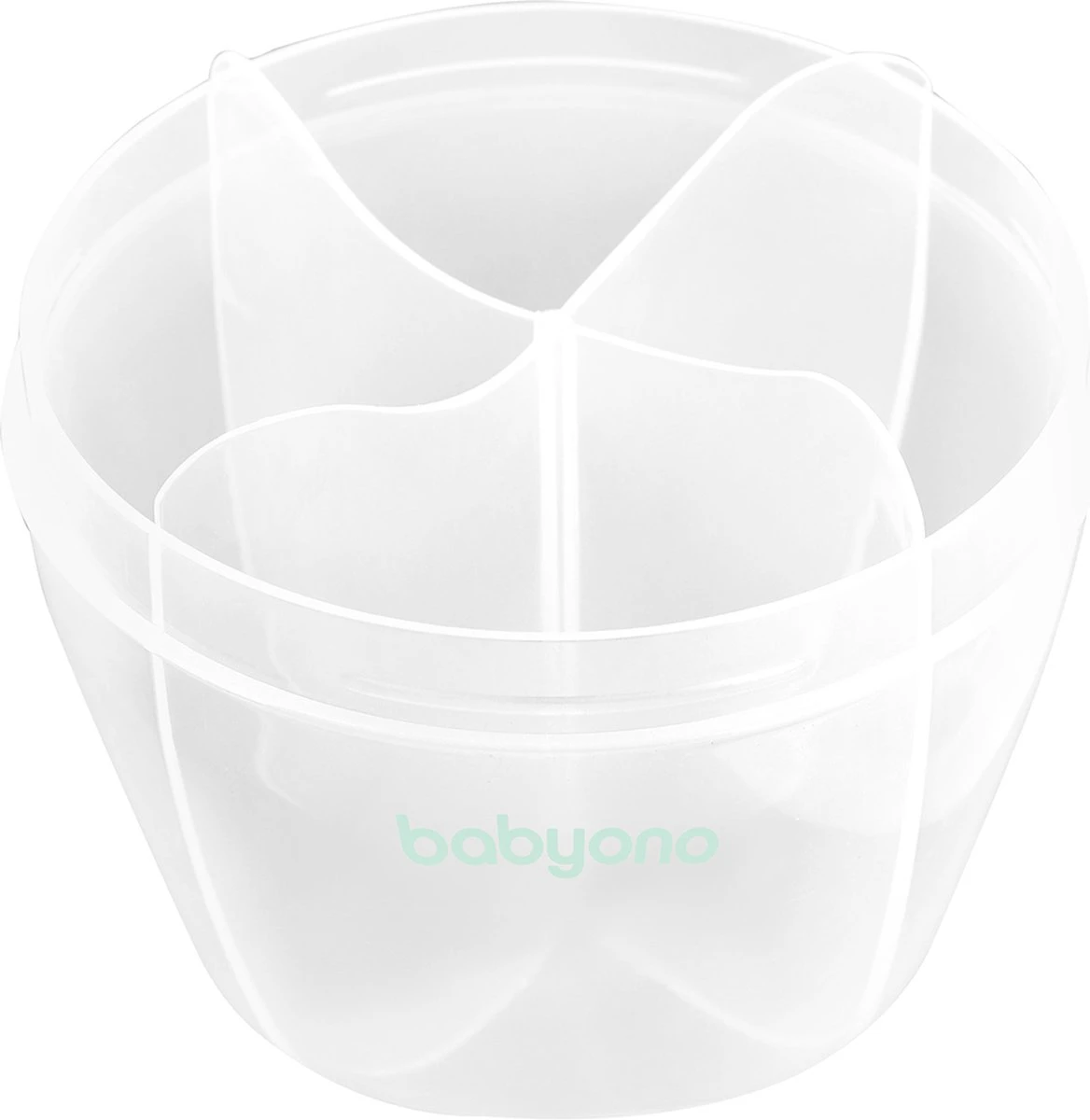 Avec cette tasse de stockage de lait en poudre pratique de Bébé Ono, vous avez toujours une réserve de lait en poudre à portée de main pour votre tout-petit. La tasse de stockage est transparente pour que vous puissiez toujours voir combien il reste dedans et contient 4 espaces séparés qui sont idéaux pour les quantités pré-pesées de lait en poudre.
