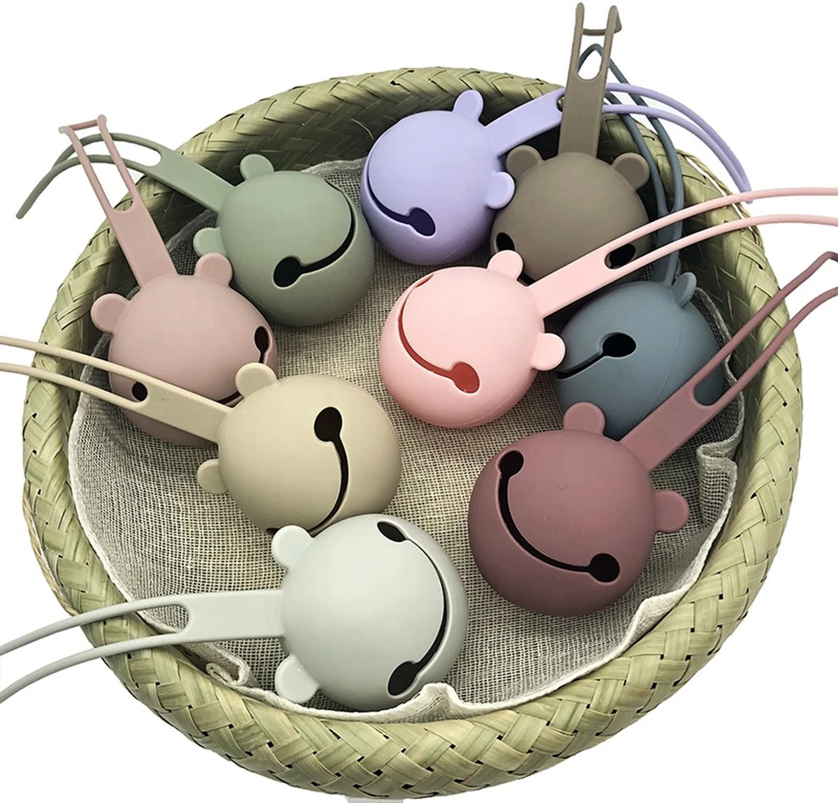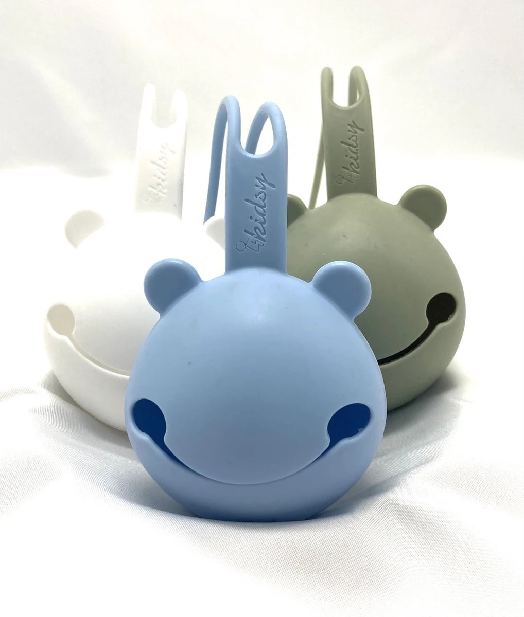 Geen les tétines qui traînent avec le porte-tétine en silicone Kidsy. Cette balle ronde ludique avec oreilles et smiley peut contenir jusqu’à 3 tétines. Il a une boucle lisse mais robuste et peut facilement être attaché à un sac à langer, une poussette ou un lit bébé. Cela signifie que vous avez toujours la tétine de bébé à portée de main.