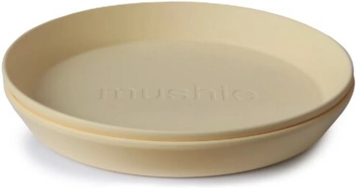 Ce bel ensemble de deux assiettes rondes est de la marque Mushie.