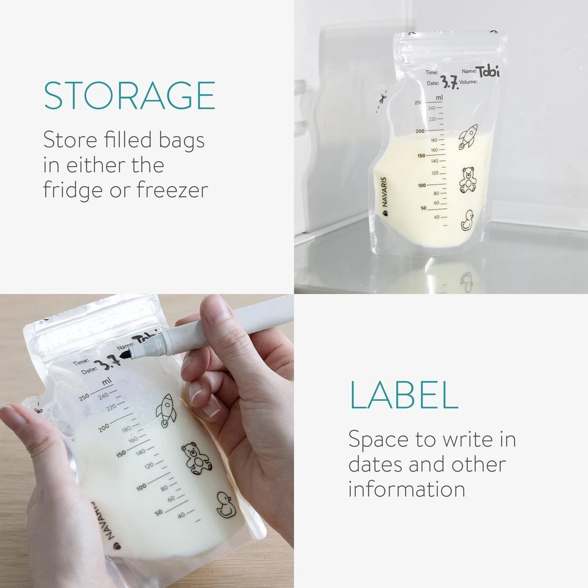 - Navaris du lait maternel Navaris sont idéaux pour conserver ou transporter le lait maternel. De cette façon, vous ne gaspillez pas de lait et vous en avez toujours une réserve pour votre bébé. Vous pouvez pomper directement dans les sacs.
