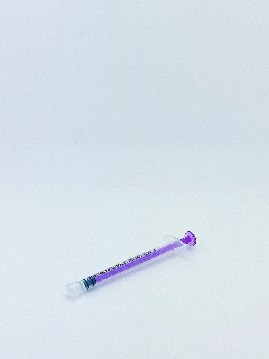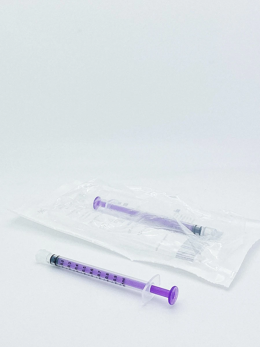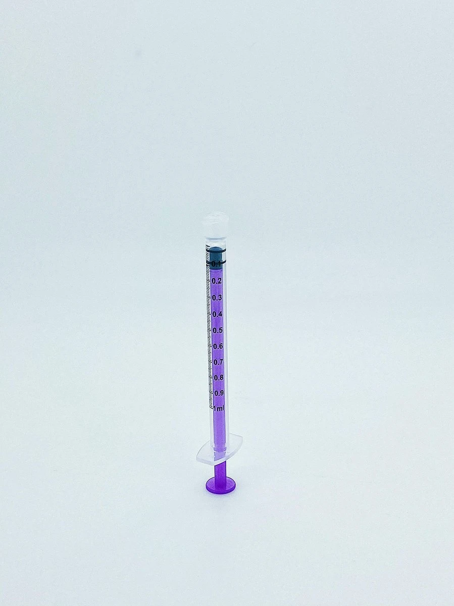 Les seringues transparentes avec pilon violet ont une échelle par ml très clairement lisible afin que la lecture de la quantité correcte soit facile et efficace. Cette seringue a une contenance de 1 ml.