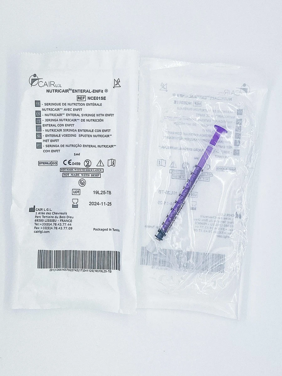 Les seringues Nutricair sont équipées d’une connexion ENFit qui assure une connexion très sûre entre les systèmes d’alimentation. Le système ENFit réduit le risque de mauvaise administration.