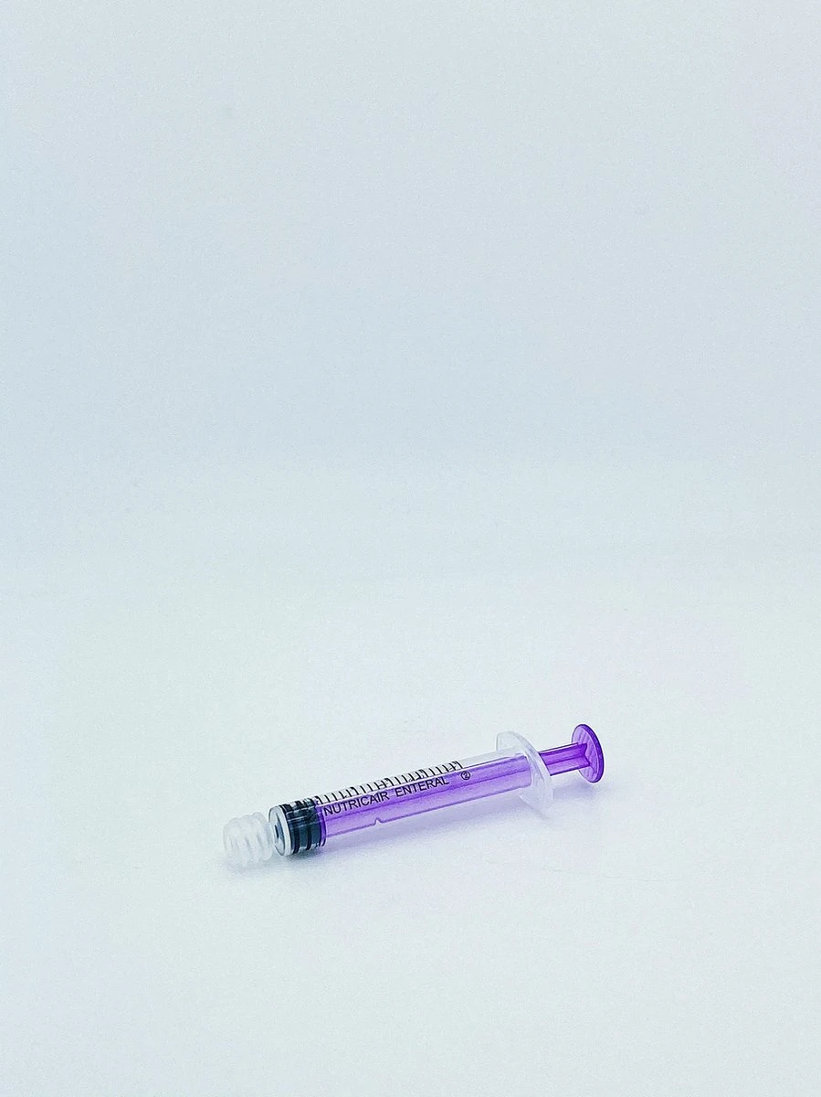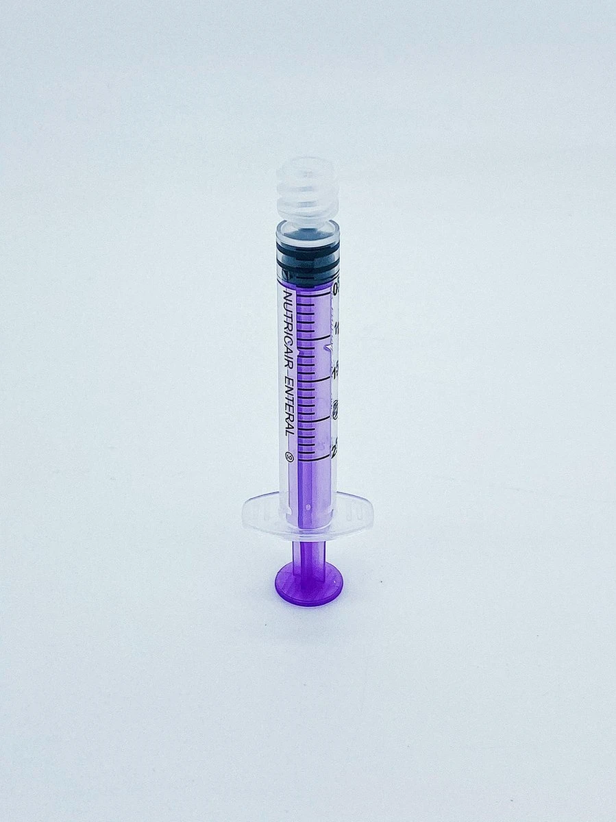 Les seringues transparentes avec pilon violet ont une échelle par ml très clairement lisible afin que la lecture de la quantité correcte soit facile et efficace. Cette seringue a un volume de 2 ml.