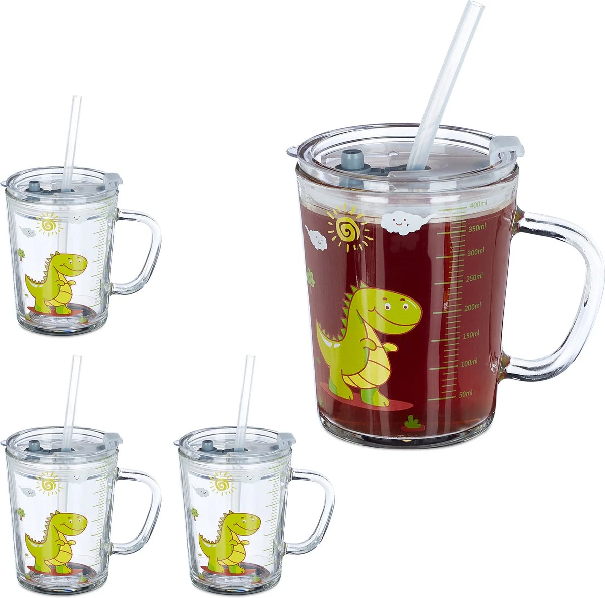 Ces 4 lunettes pour enfants enchanteront vos tout-petits avec les dessins amusants de dinosaures dessus. Ils sont non seulement jolis, mais aussi très pratiques. Les deux verres ont une anse, un couvercle et une paille. Cela rend les lunettes particulièrement utiles pour les enfants. Si vous ne voulez pas boire avec une paille, vous pouvez simplement utiliser l’ouverture séparée dans le couvercle – qui peut également être fermée sans aucun problème. Après utilisation, vous pouvez simplement mettre les gobelets en verre au lave-vaisselle.