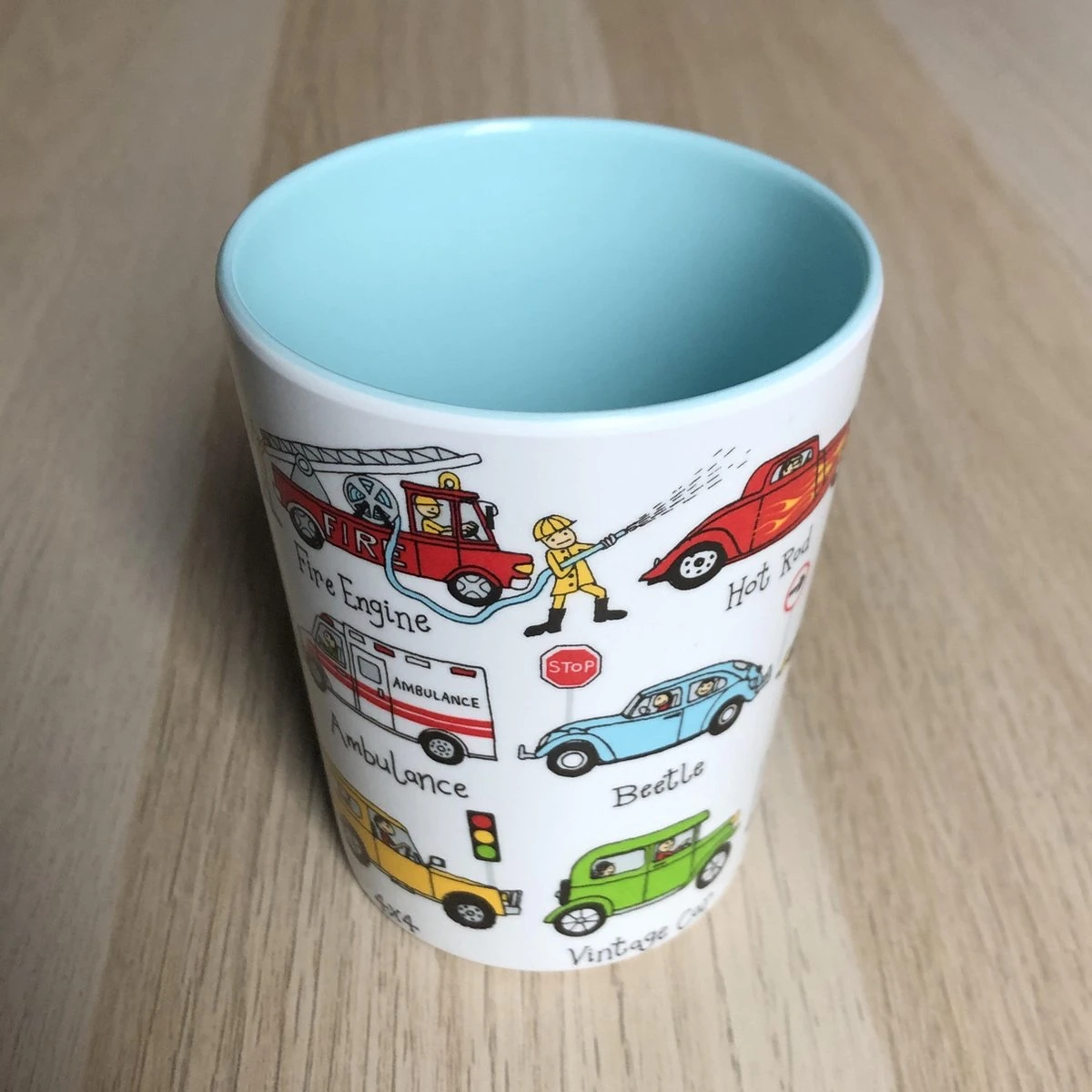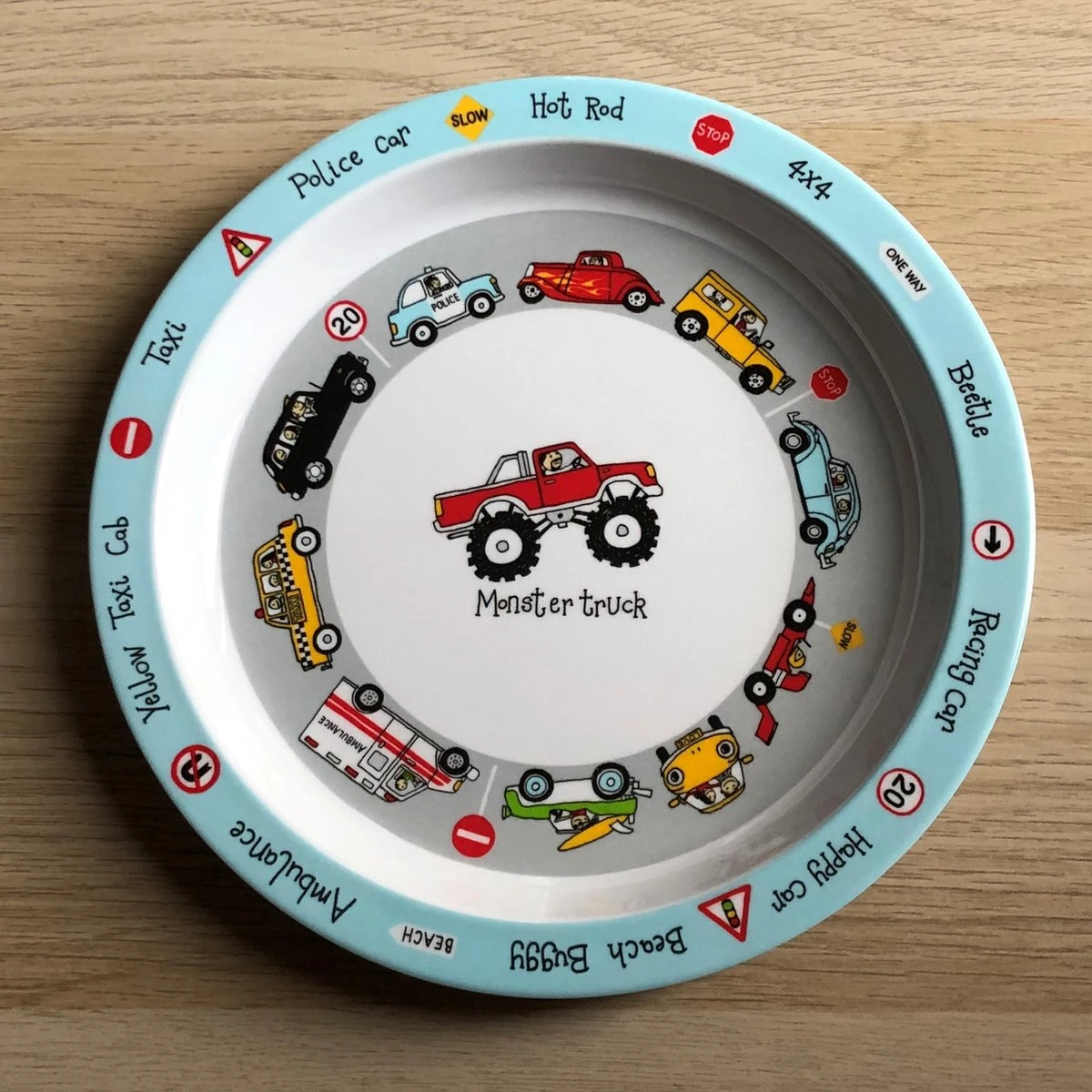 vaisselle pour enfants en mélaminé par Tyrrell Katz (Londres)avec des illustrations drôles de Voitures