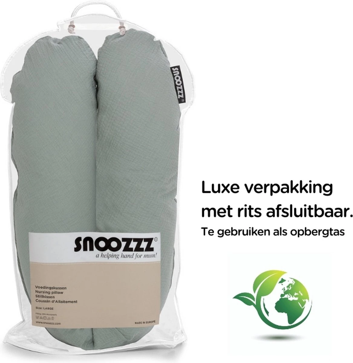 ✓Le coussin de grossesse Snoozzz est emballé dans un sac en plastique luxueux qui peut être complètement fermé avec la fermeture éclair en bas. De cette façon, vous pouvez facilement ranger le coussin de grossesse lorsque vous ne l’utilisez pas. Grâce aux poignées sur le sac, l’oreiller d’alimentation est également facile à transporter.