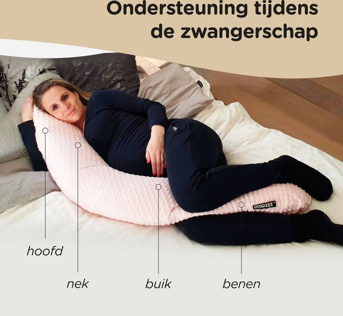 Le coussin de grossesse Snoozzz peut être utilisé de différentes manières. Pour soutenir votre ventre de femme enceinte, allongez-vous sur le côté avec votre ventre sur le coussin de grossesse et une jambe sur le coussin de grossesse. Grâce au remplissage silencieux de micro perles, il forme