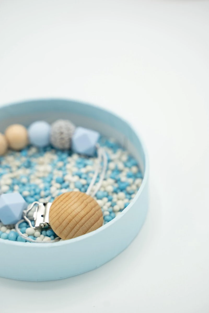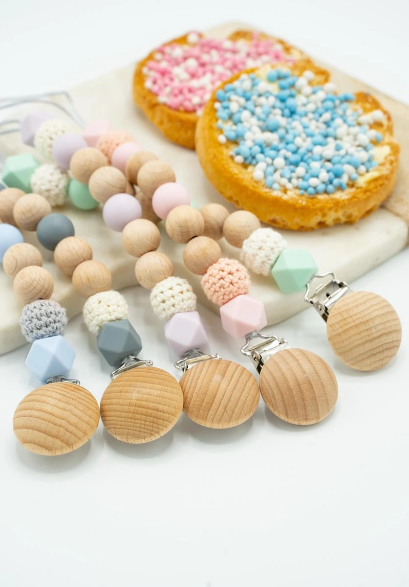 Pour la sécurité de l’enfant. L’attache tétine doit être vérifiée avant chaque utilisation. Jetez-les au premier signe de défauts ou de dommages. Ne déployez jamais l’attache-tétine. Ne l’attachez jamais à des cravates, des rubans ou des vêtements amples. Votre enfant peut s’étrangler. Utiliser uniquement sous la surveillance d’un adulte. N’utilisez pas la chaîne comme aide à la mastication. Utilisez de l’eau tiède pour nettoyer la tétine. Toutes les perles en bois sont résistantes à la sueur et à la salive, sans couleur ni substances nocives. Seuls les clips en nickel et en acier inoxydable avec trous de ventilation sont utilisés. Les cordons utilisés sont résistants à la salive et aux couleurs et ont une haute résistance à la déchirure (exigence de résistance à la déchirure de 25 Newton). Gardez à l’esprit que le bois, matériau naturel, est plus sensible à l’usure que les produits fabriqués à partir d’autres matériaux. L’abrasion de la couleur peut (mais n’est pas obligatoire) se produire en rapport avec la salive. Les peintures et vernis hydrosolubles utilisés sont non toxiques (sans danger pour les aliments) et il n’y a donc aucun risque pour l’enfant. NE PAS mettre de produits en bois dans le stérilisateur, sous l’eau courante, au lave-vaisselle ou à la machine à laver.
