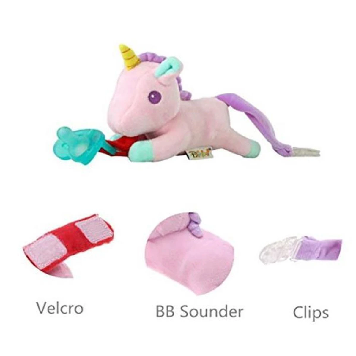 Vous pouvez facilement attacher la tétine avec la fermeture Velcro. Il y a un clip sur la queue que vous pouvez facilement attacher à n’importe quel vêtement.